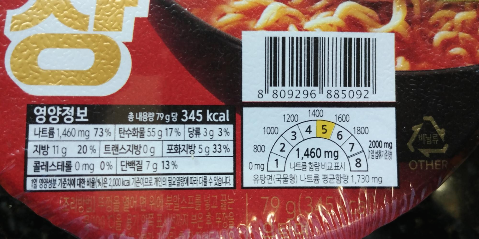 확실히 작은 컵라면이기 때문에 그다지 영양성분은 높은 편이 아닙니다. 하지만 나트륨은 눈여겨볼 필요가 있는데, 나트륨 함량이 1,460mg으로 73%나 됩니다. 국물형 컵라면 나트륨 평균 함량이 1,730mg이라고는 하지만 작은 컵라면이라는 것을 고려해 보면 상당히 많은 나트륨이 들어있다고 볼 수 있습니다.