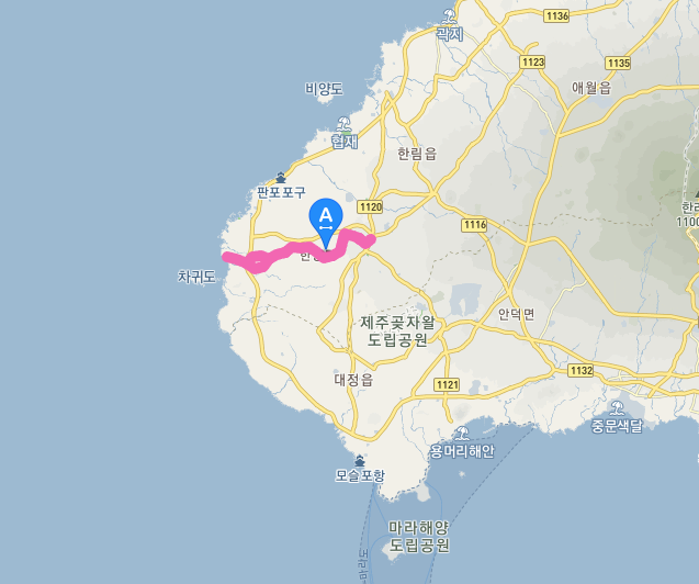 가장 먼저 제주 올레길 13코스의 위치와 경로가 나와있는 지도를 보여드리도록 하겠습니다.