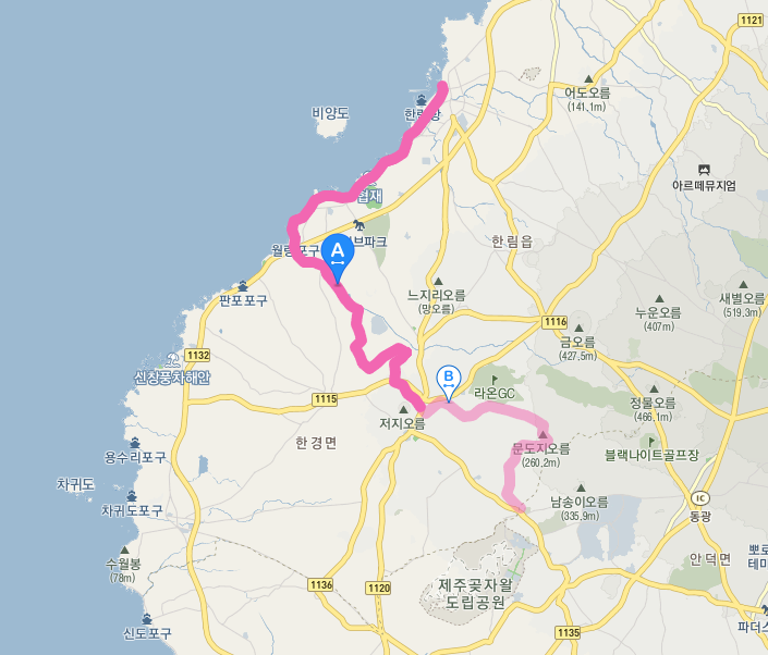 오늘은 제주 올레길 5코스 트레킹 후기를 말씀드려보도록 하겠습니다. 가장 먼저 올레길 5코스의 경로를 보여드리도록 하겠습니다. 제주 올레길 5코스의 경로는 위와 같습니다. 더 멀리서 보면,