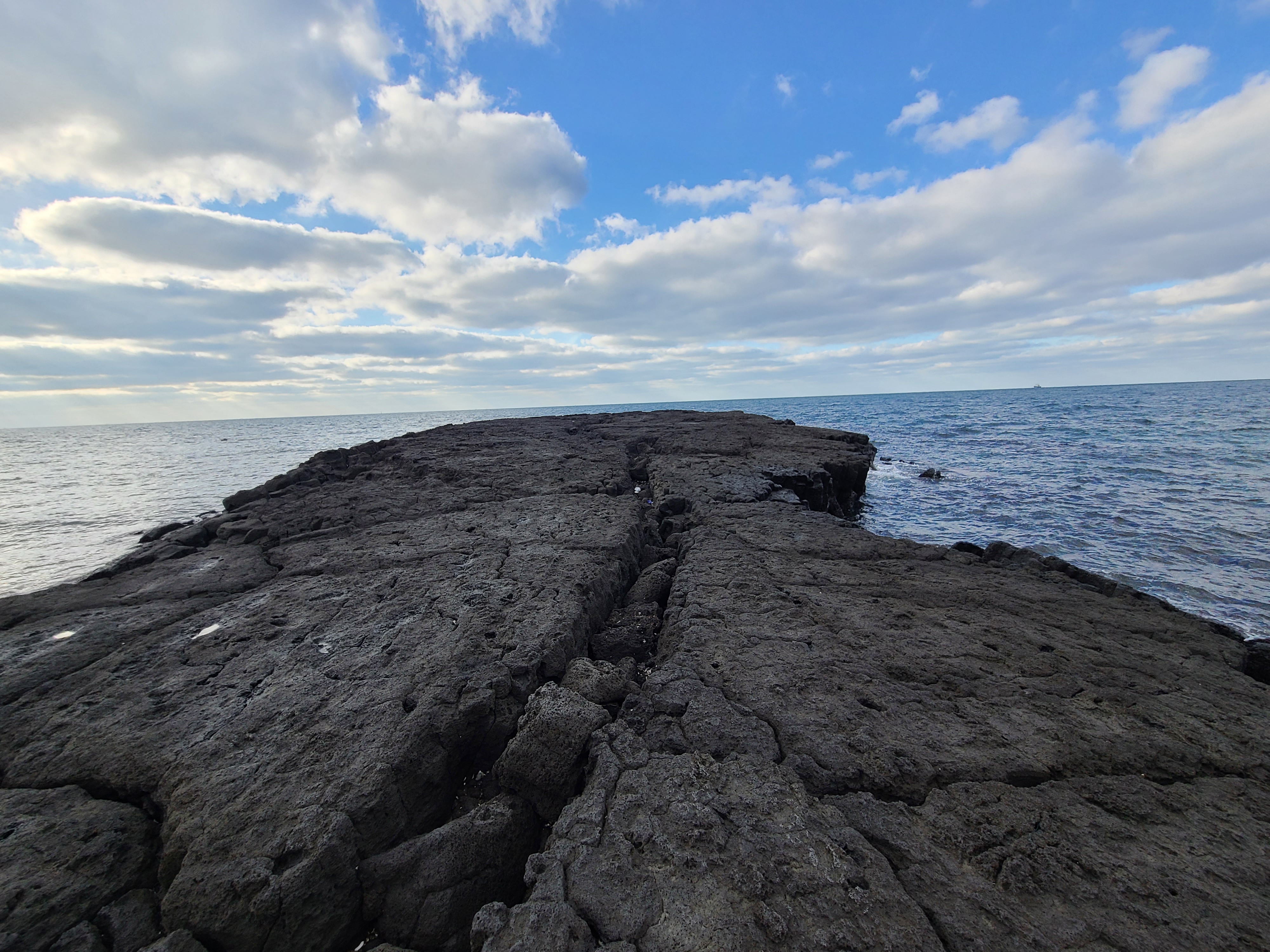 바다 위에 솟아있는 현무암 섬이 있네요.