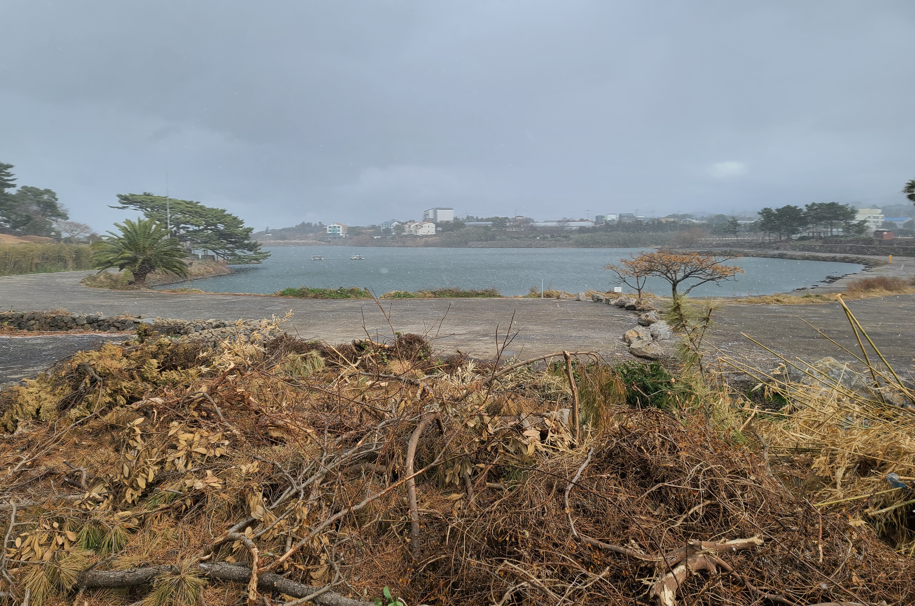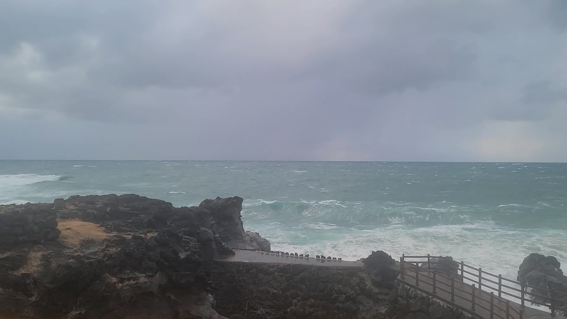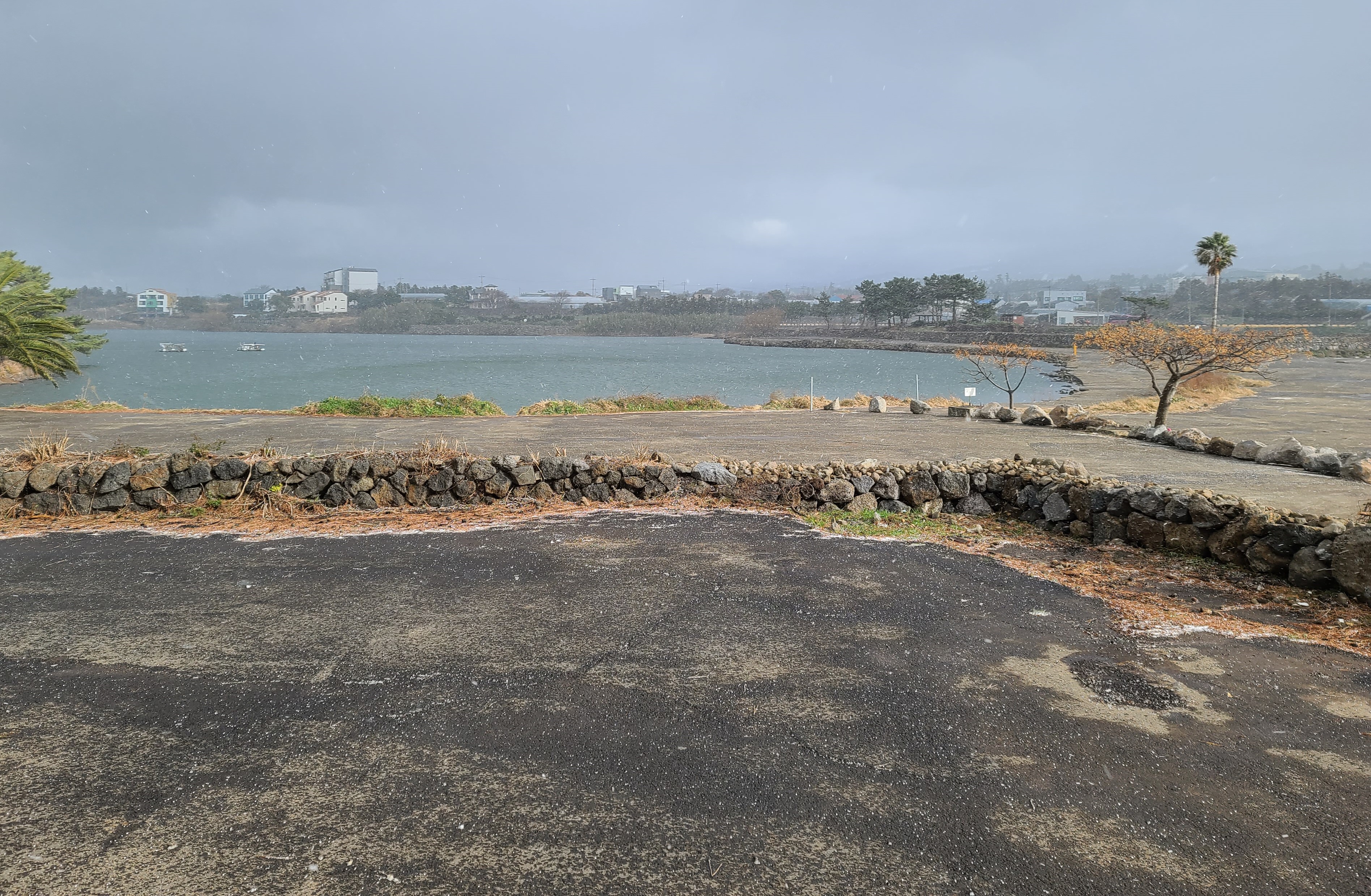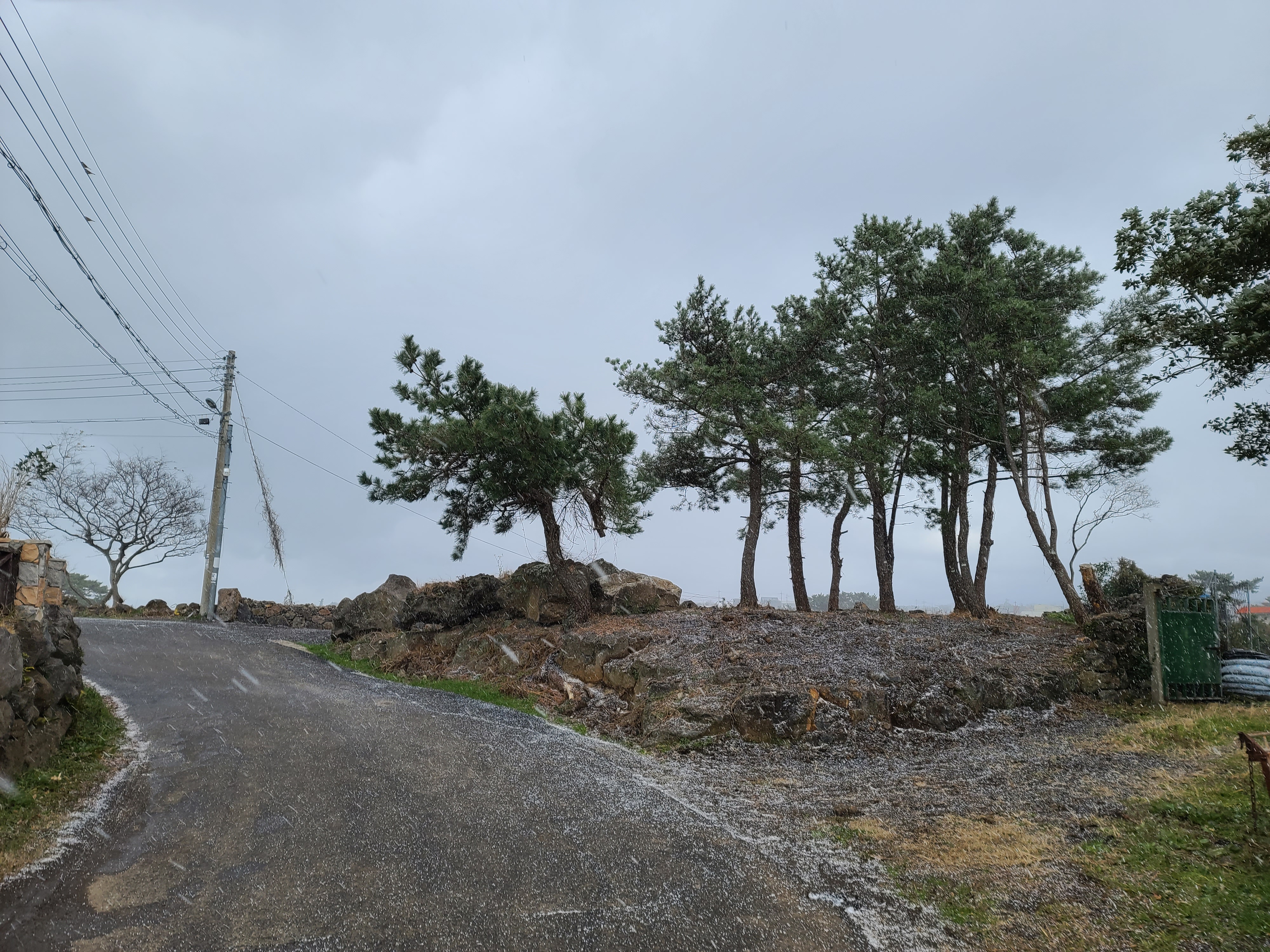 우박이 내리는 제주 올레길 16코스의 풍경입니다.