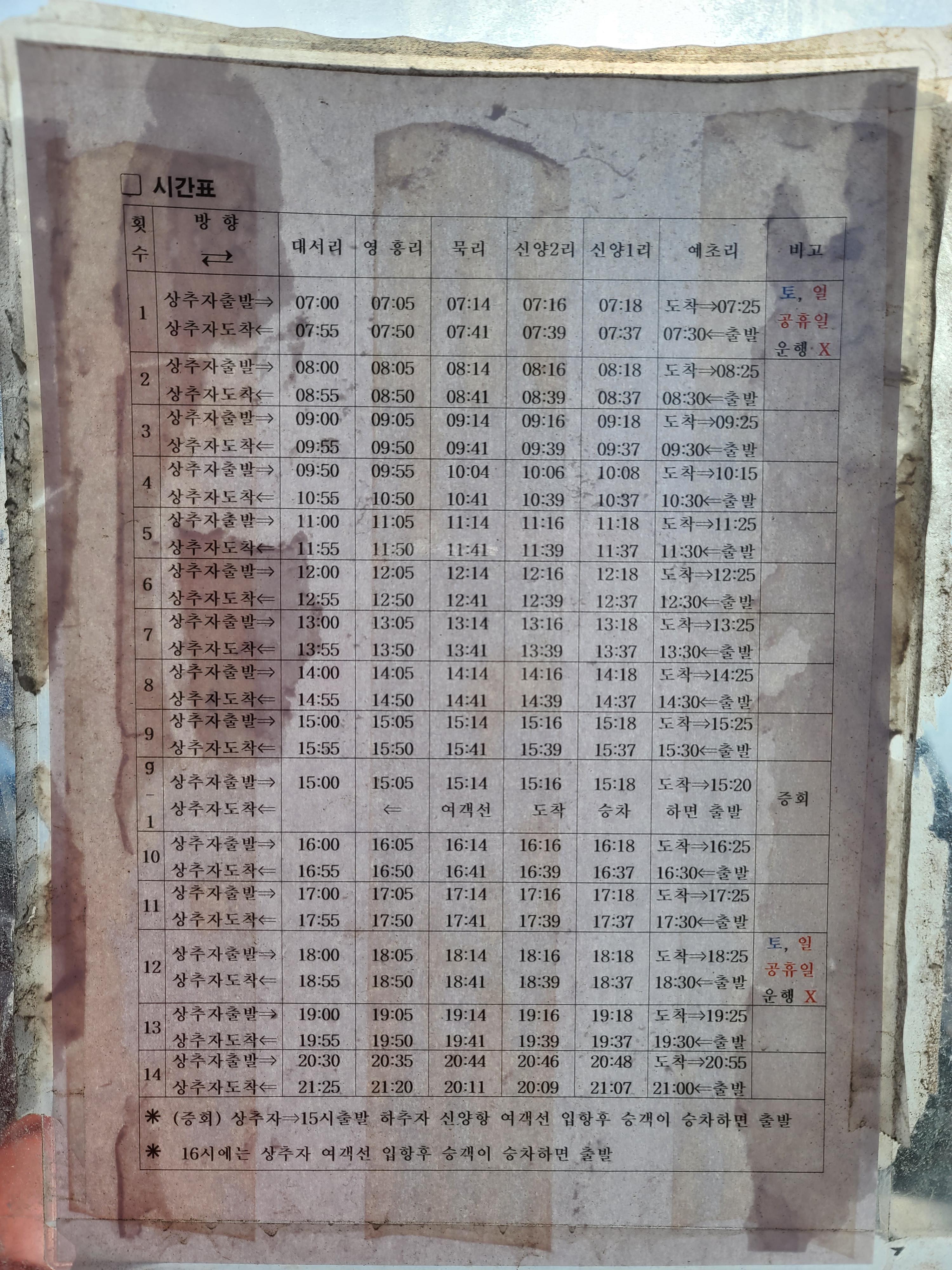 저는 상추자도에서 16시 30분에 있는 배를 타야했기 때문에 예초리에서 15시 30분에 출발하는 추자도 순환버스를 탔습니다.