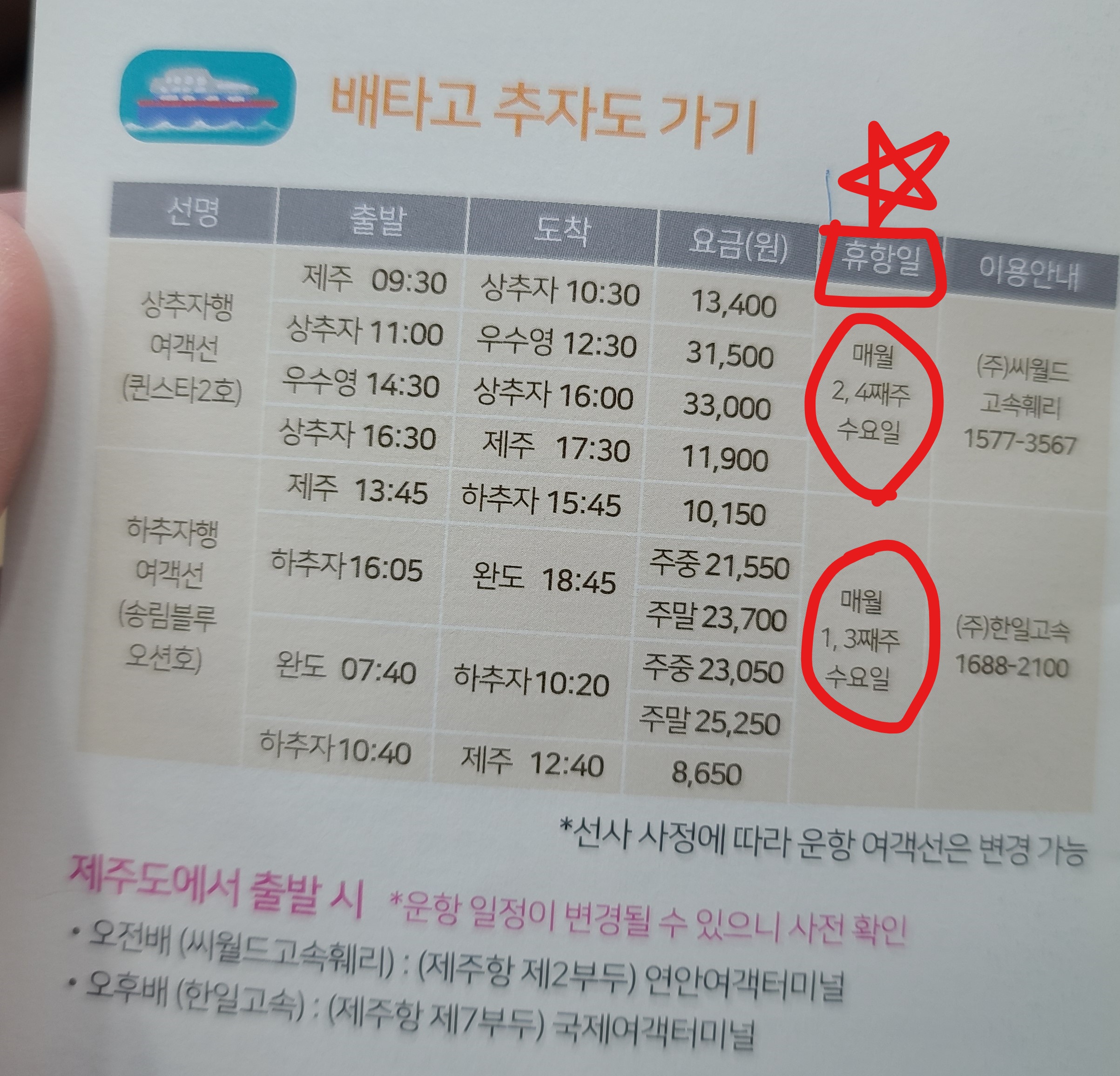 하추자행 여객선은 매월 1, 3째주 수요일에 휴항을 하니 이에 유의하여 추자도 여행을 세우셔야 합니다.