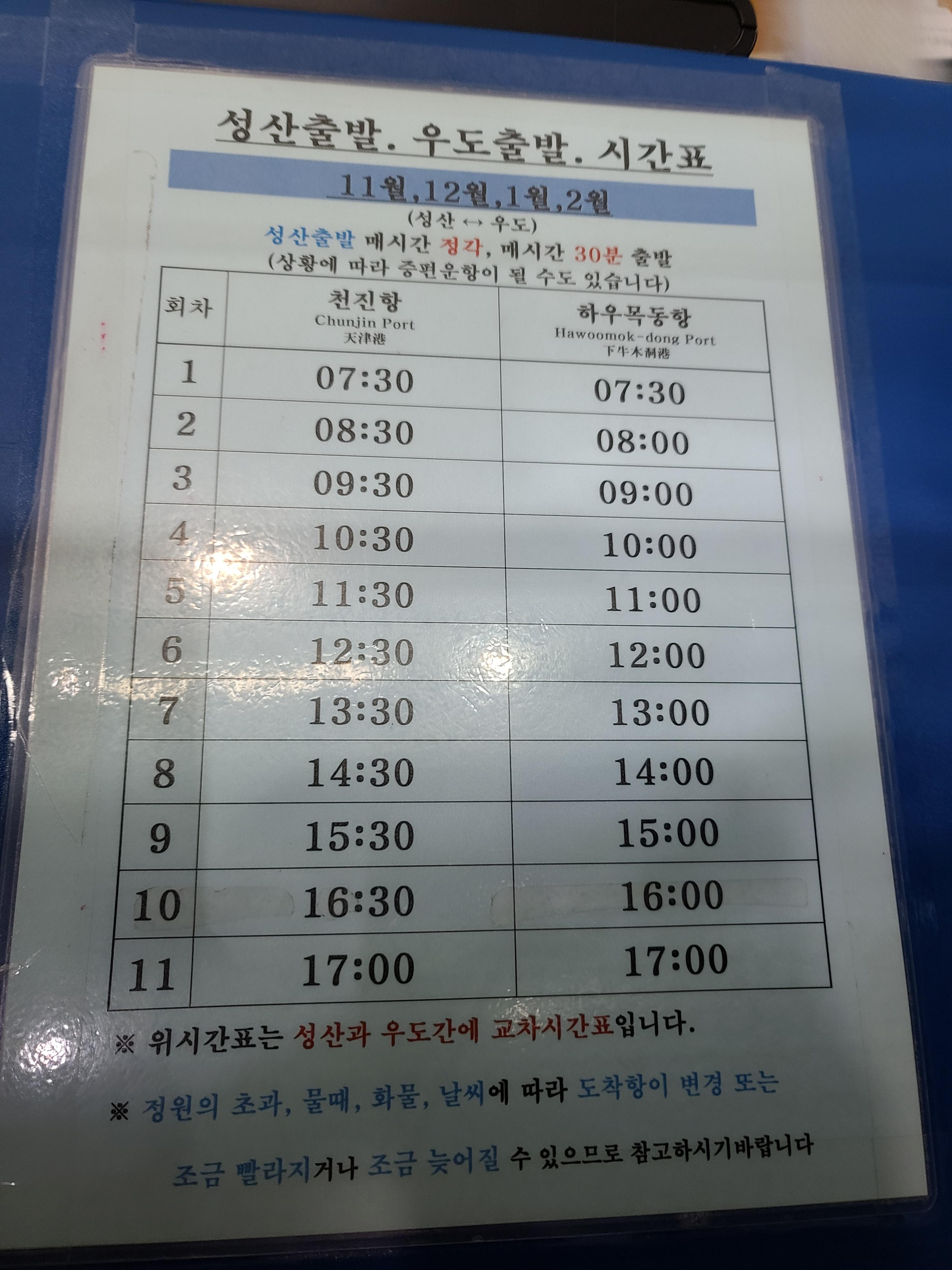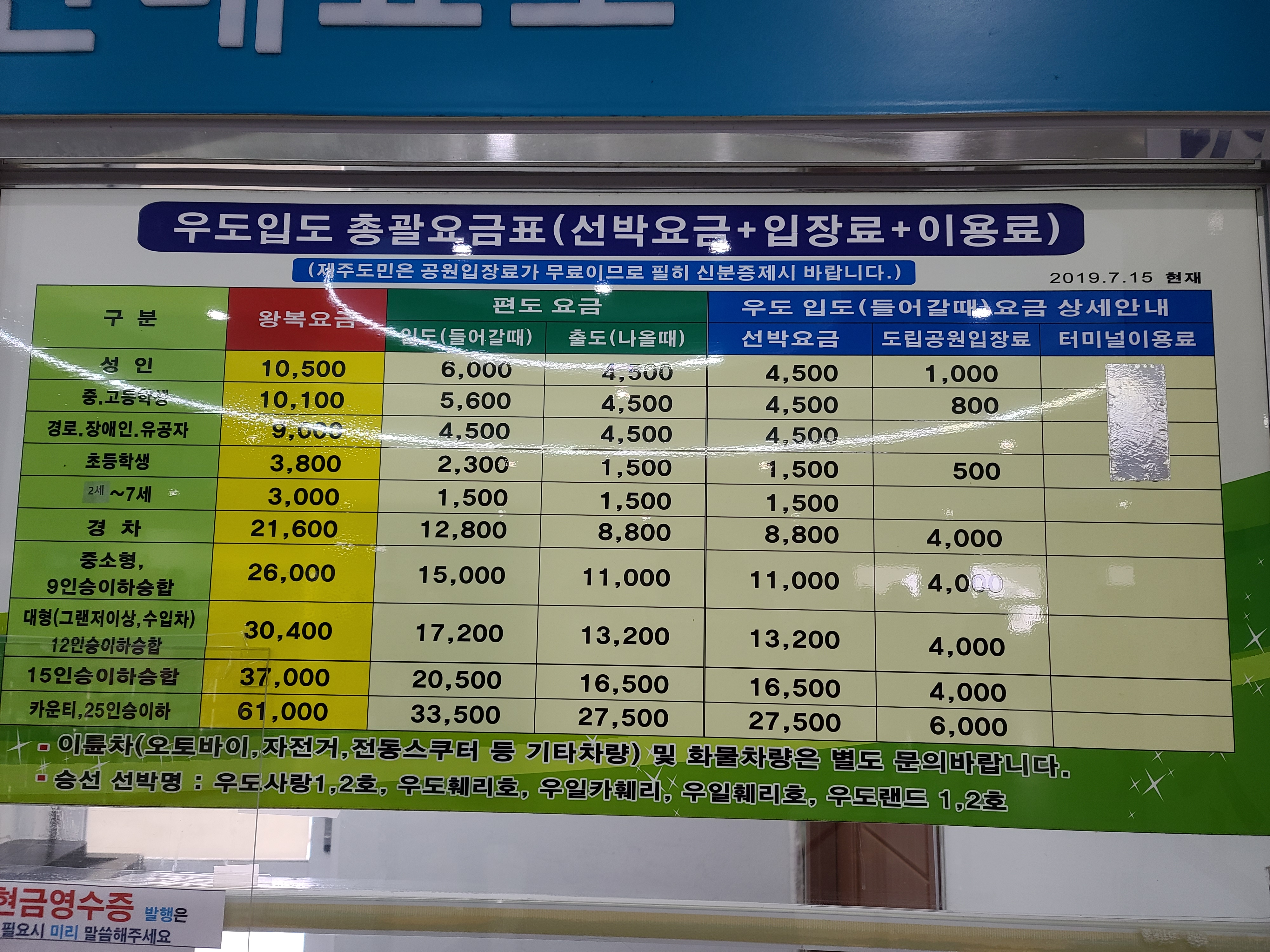 우도로 들어가고 나오는 배 시간표와 요금은 위 표를 참고해주시면 되겠습니다.