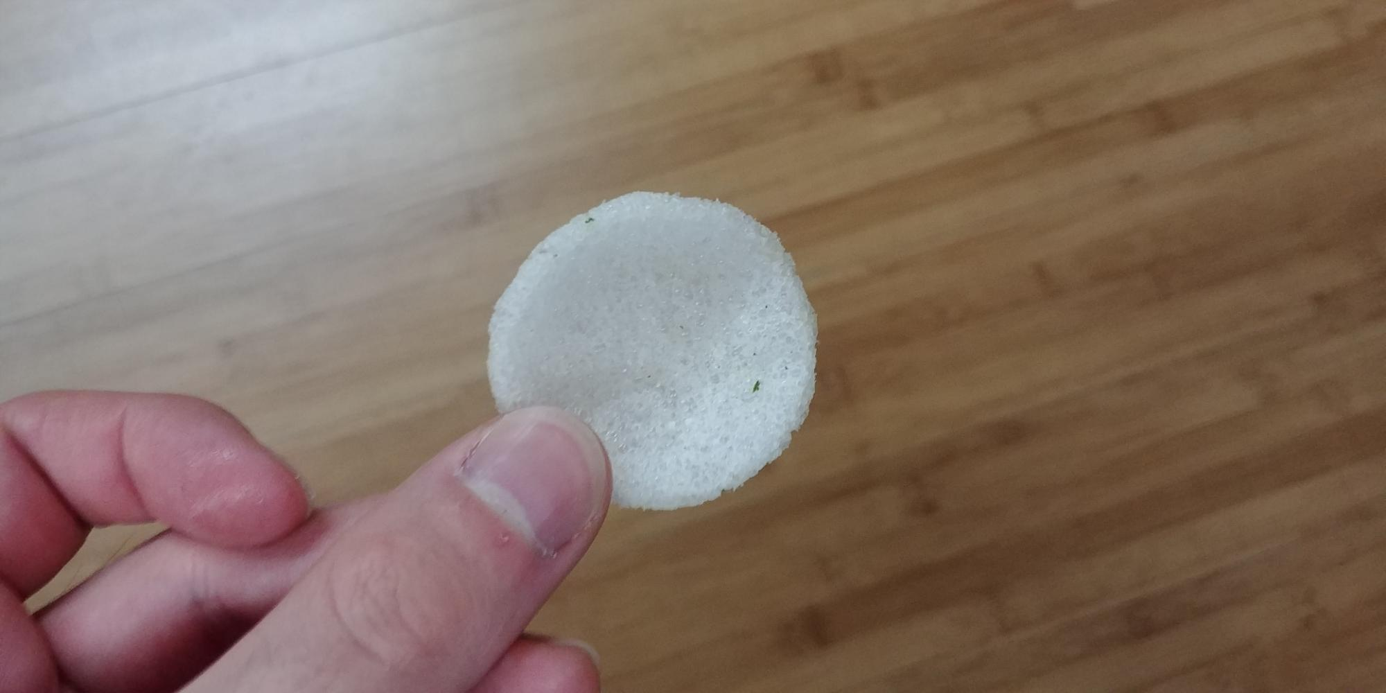 낱개로 보면 이렇습니다. 하얀색 과자인데 군데군데 초록색 가루가 묻어있습니다. 아무래도 노브랜드 바삭한 갈릭 새우칩이다 보니 뭔가가 묻어있는 것 같습니다. 하지만 마늘은 흰색인데 왜 초록색 가루가 묻어있는지는 잘 모르겠습니다.