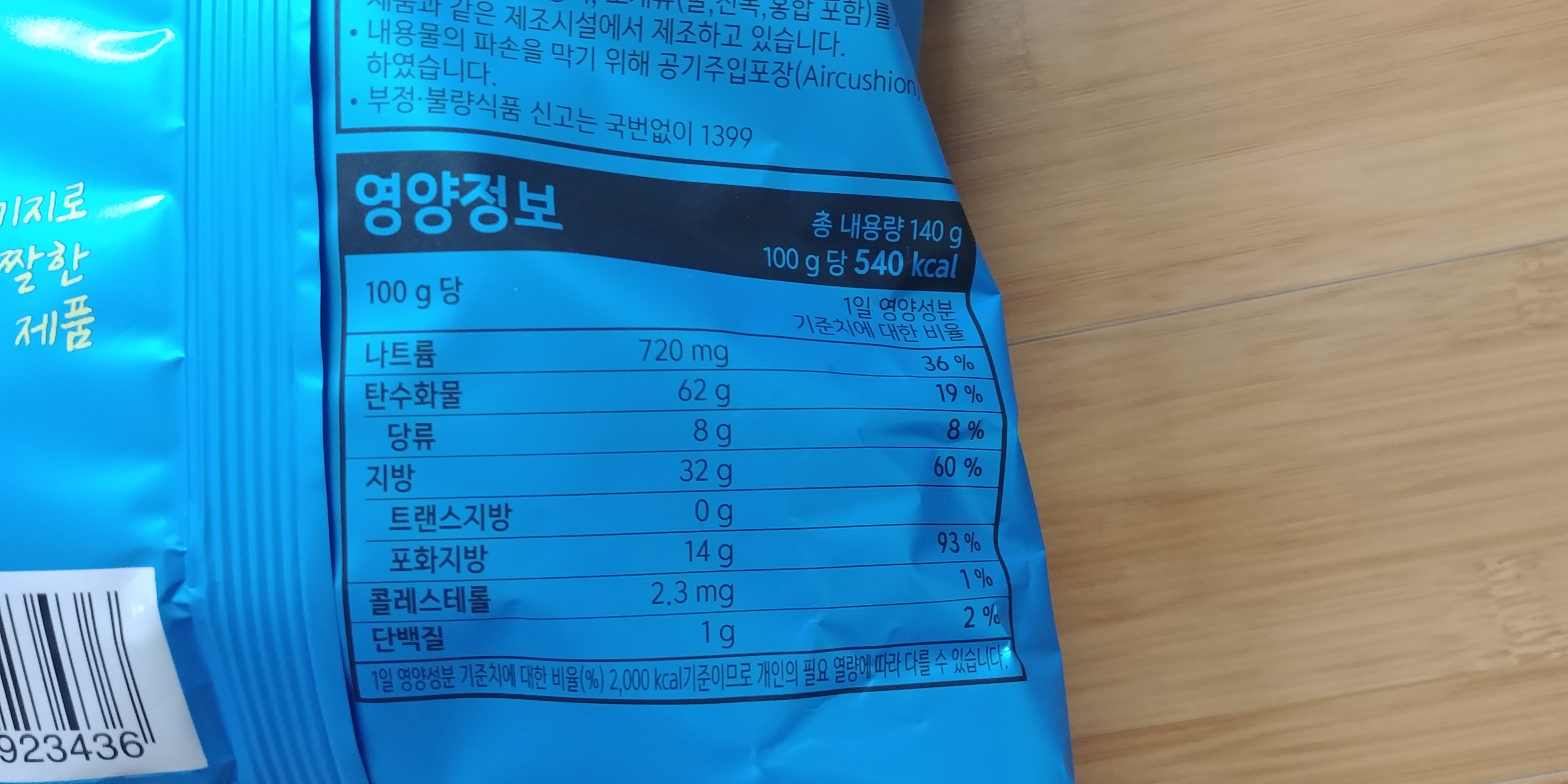 그런데 100g당 기준임에도 불구하고 지방은 60%이고 포화지방은 93%입니다. 어차피 건강해지려고 과자를 먹는 게 아니라는 생각을 가지신 분들은 영양정보를 굳이 신경 쓰지 않으시겠지만, 이 부분에 대해 민감하신 분은 주의하시기 바랍니다.