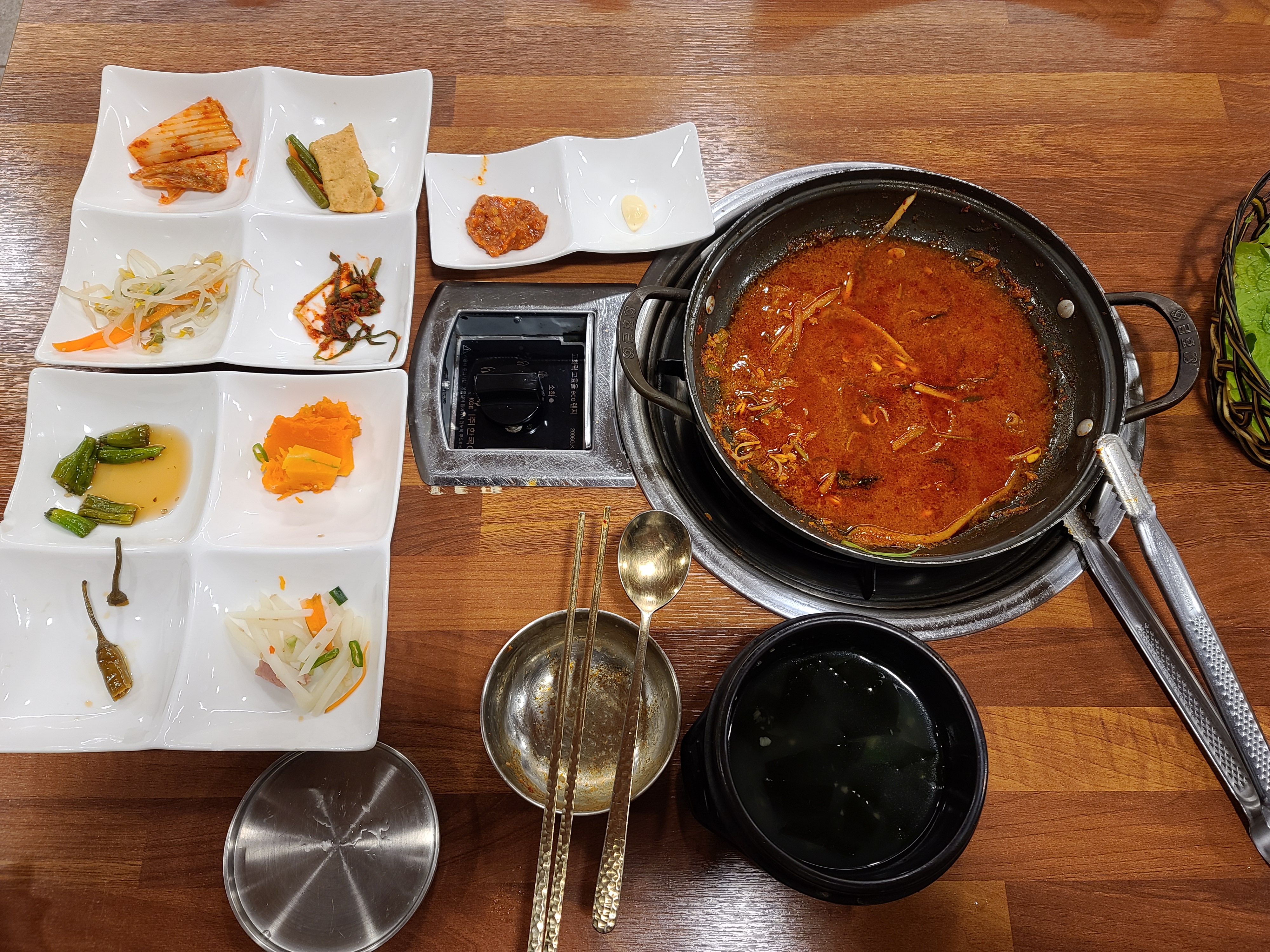 배추김치, 어묵볶음, 고추 장아찌, 감자볶음, 메추리알 꽈리고추 조림, 숙주나물, 호박 샐러드 등이 밑반찬으로 나왔습니다.
