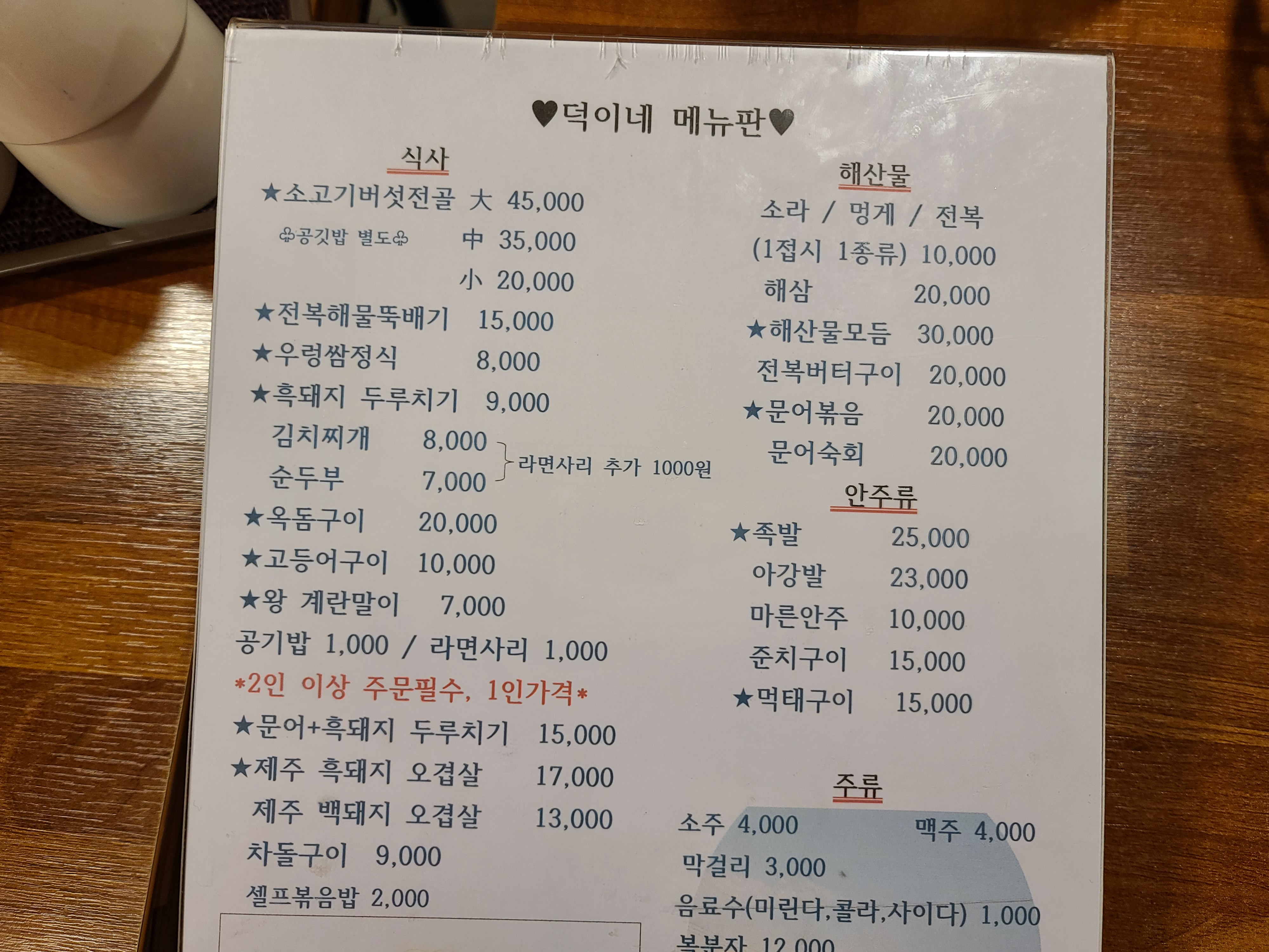 제주 온평리 맛집 성산덕이네 메뉴판입니다.