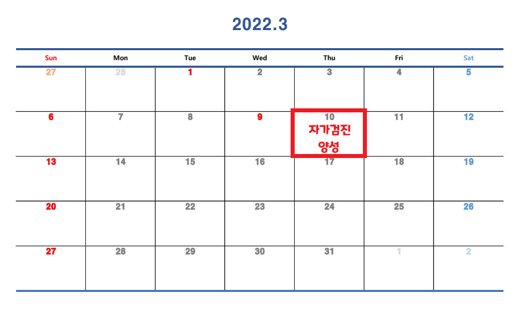 저는 2022년 3월 10일 오전에 자가검진 키트 두 줄(양성)을 확인했습니다.