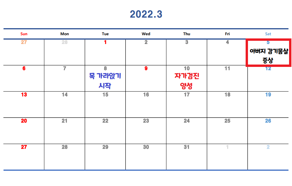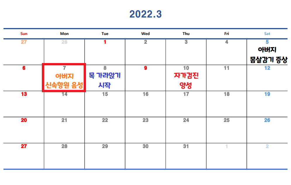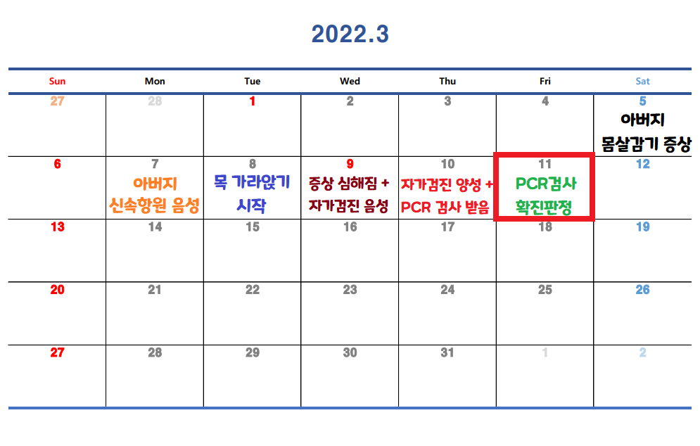 이렇게 봤을 때에는 처음 감기몸살 증세가 발현된 아버지로부터 오미크론에 감염된 것으로 추정됩니다.