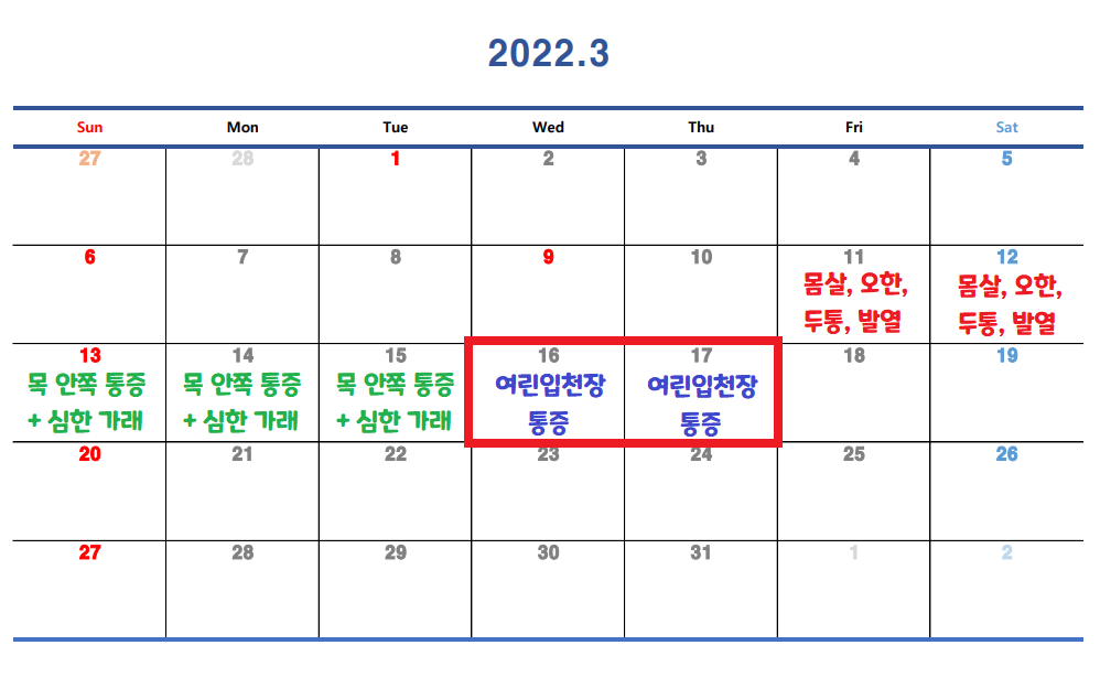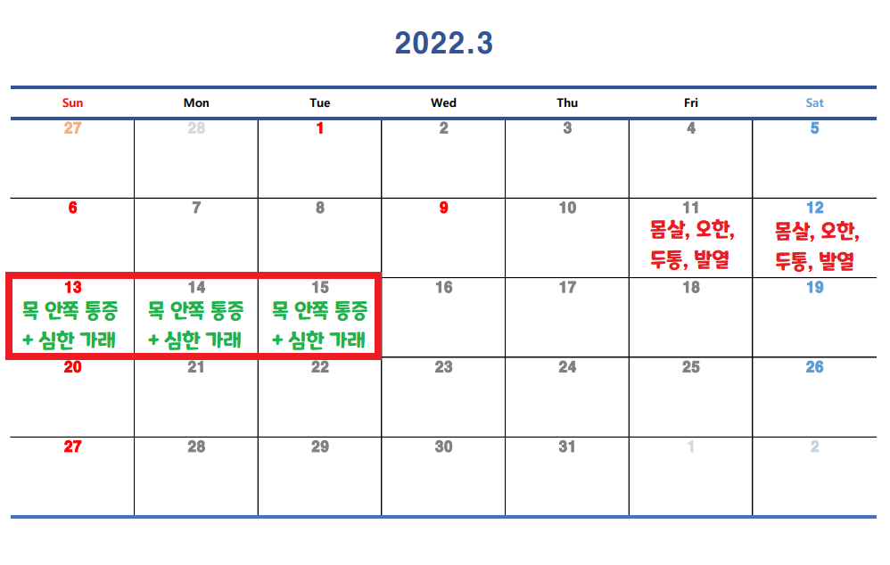 3월 13일~15일은 목 안쪽 통증이 새롭게 발현되기 시작했습니다.