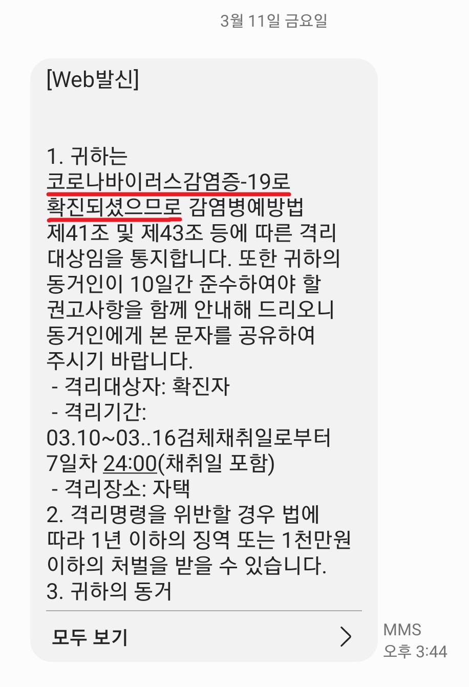 목차 1에서 말씀드렸다시피, 저는 3월 11일에 PCR검사 양성판정을 받고 이때부터 자가격리에 들어갔습니다.