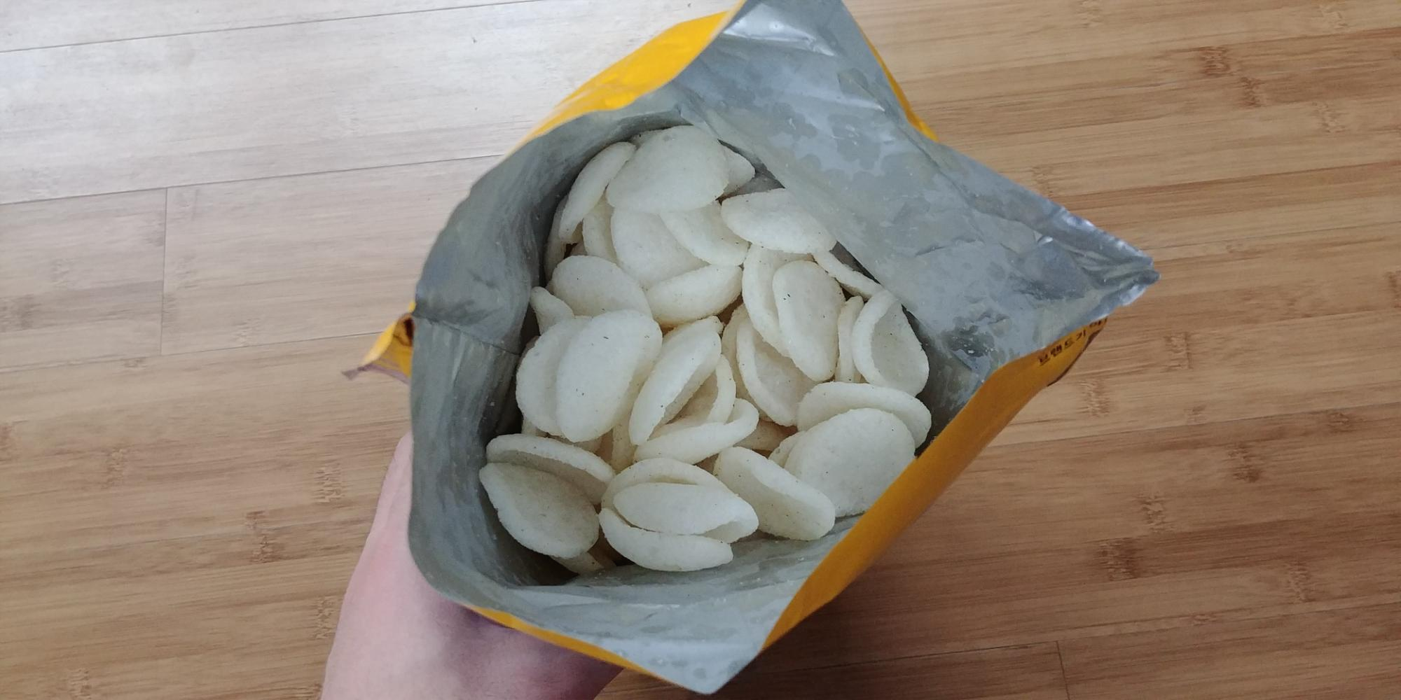 먼저 맛을 말씀드리면, 우리가 일반적으로 알고 있는 알새우칩 류의 과자 맛과 약간 다릅니다. 농심 알새우칩은 뭔가 짭짤한 느낌이 있는데, 노브랜드 바삭한 갈릭 새우칩은 담백하고 약간 단맛이 납니다. 여기서 단맛은 초콜릿의 단맛이 아니라 담백한 느낌의 단맛입니다. 대표적인 예로는 탄수화물, 그러니까 쌀밥을 오래 씹었을 때 느껴지는 단맛이라고 볼 수 있는데, 이 단맛보다는 살짝 더 많이 느껴지는 단맛입니다.