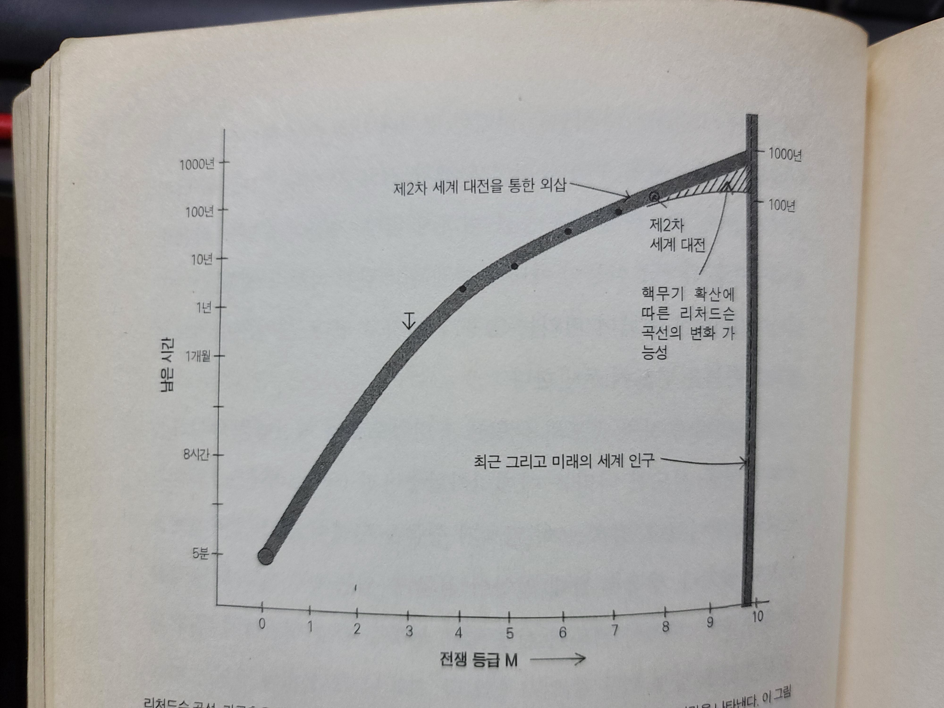 리처든스는 적어도 1,000년 후에야 모든 인류가 전멸할 수 있는 10단계의 전쟁이 일어날 것이라고 예상했지만, 핵무기의 급격한 발달로 인해 그 시간이 100년으로 단축될 것이라는 내용이 위 사진에 담겨있다.