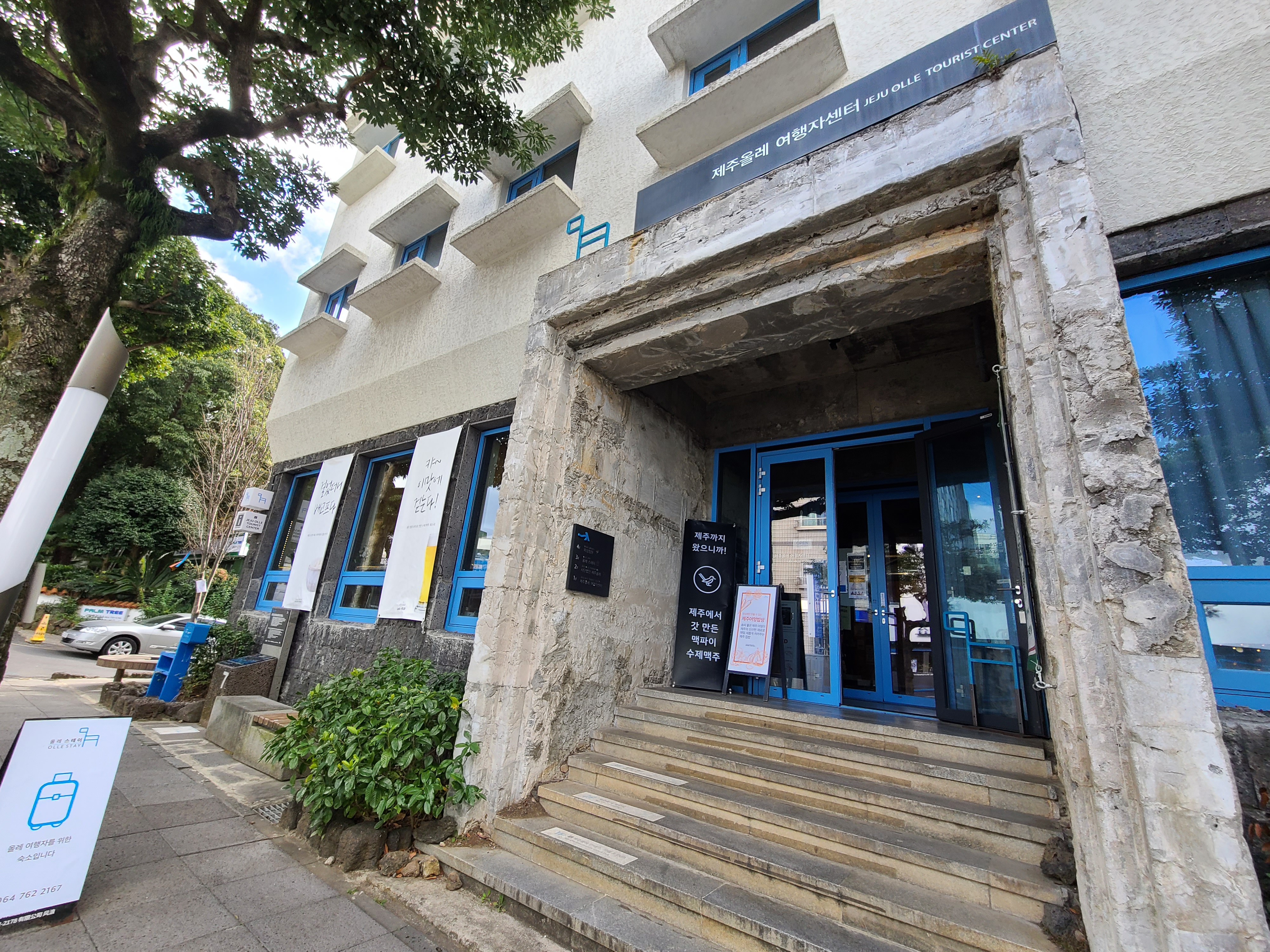 제주올레의 상징인 간세(조랑말 이름)가 지니고 있는 색깔인 하늘색을 이용하여 창틀 디자인을 해놓은 것이 인상적입니다.
