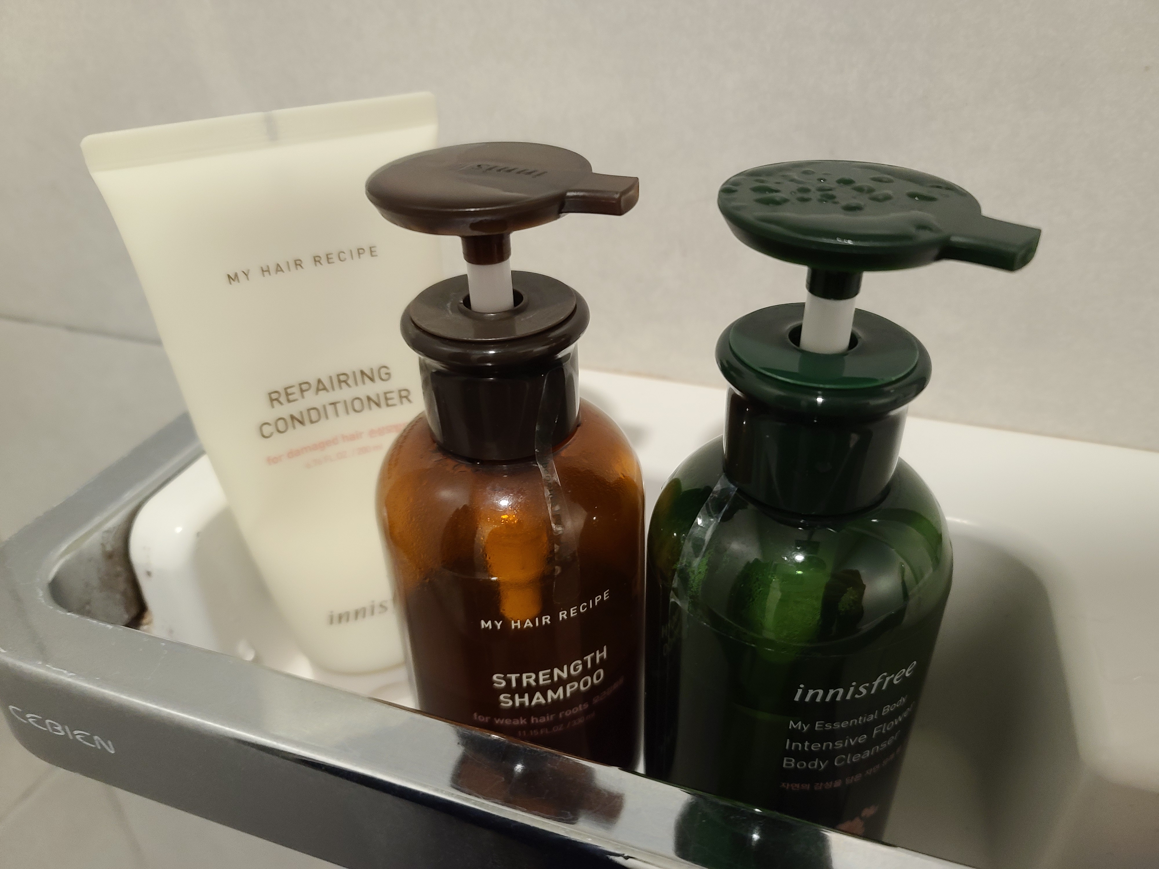 올레스테이 샤워시설에는 이니스프리 제품들이 비치되어 있습니다.