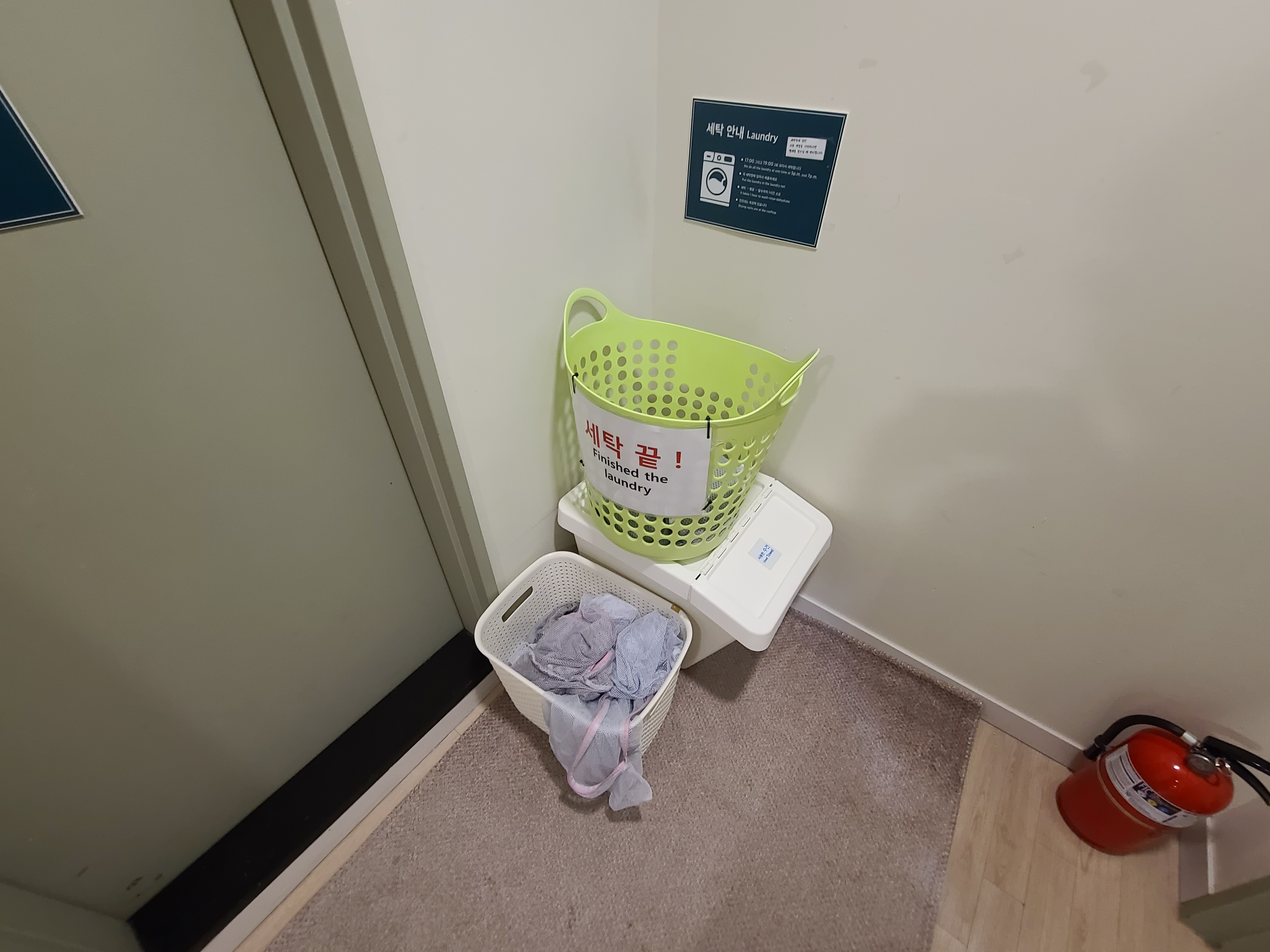 여기에 자신의 세탁감을 넣고 '세탁 끝!'이라고 표시된 바구니 아래 있는 흰색 통에 빨래망을 넣어주시면 됩니다.