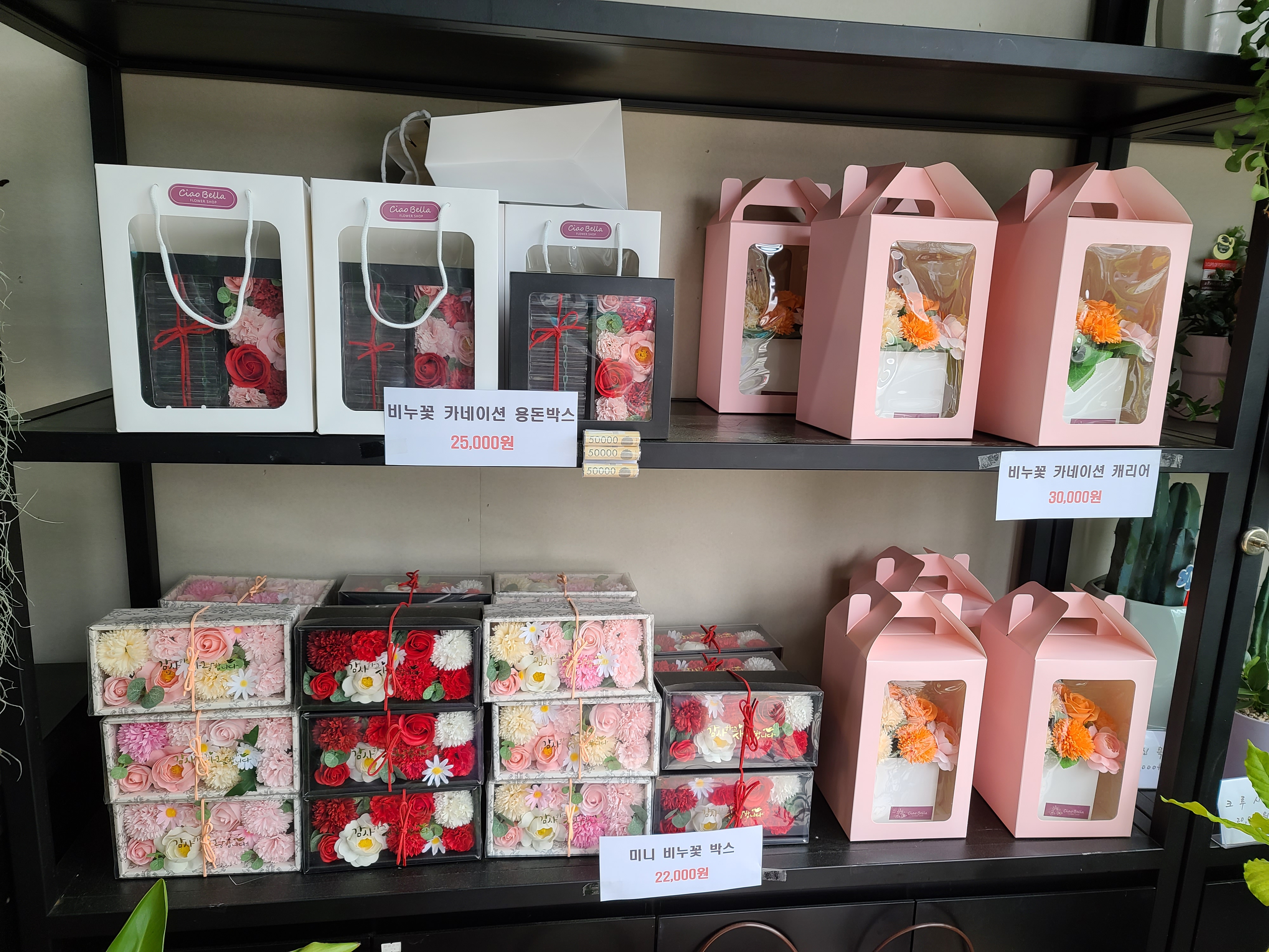 제가 신봉동 꽃집 챠오벨라에 방문했을 때가 어버이날 근처라서 이렇게 선물용 카네이션도 판매되고 있었습니다.