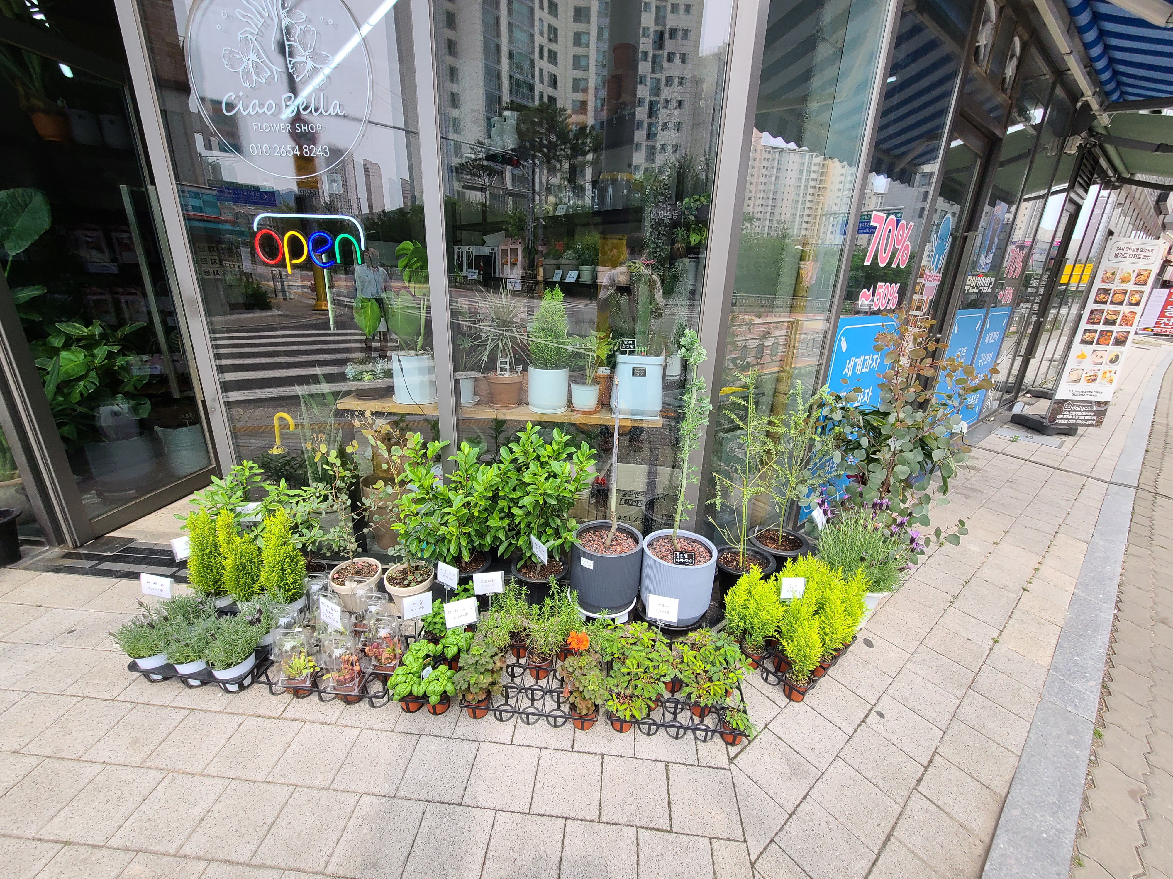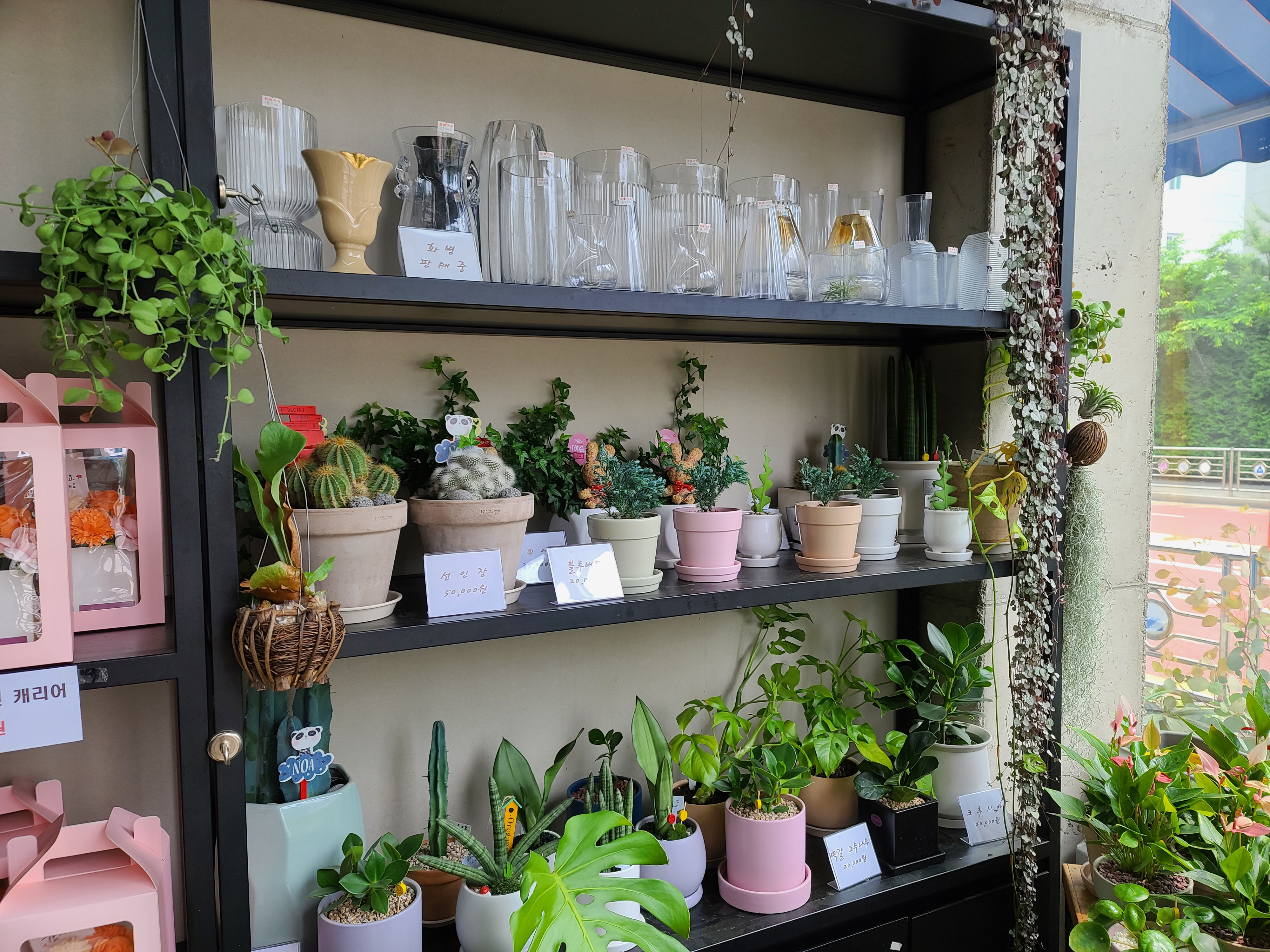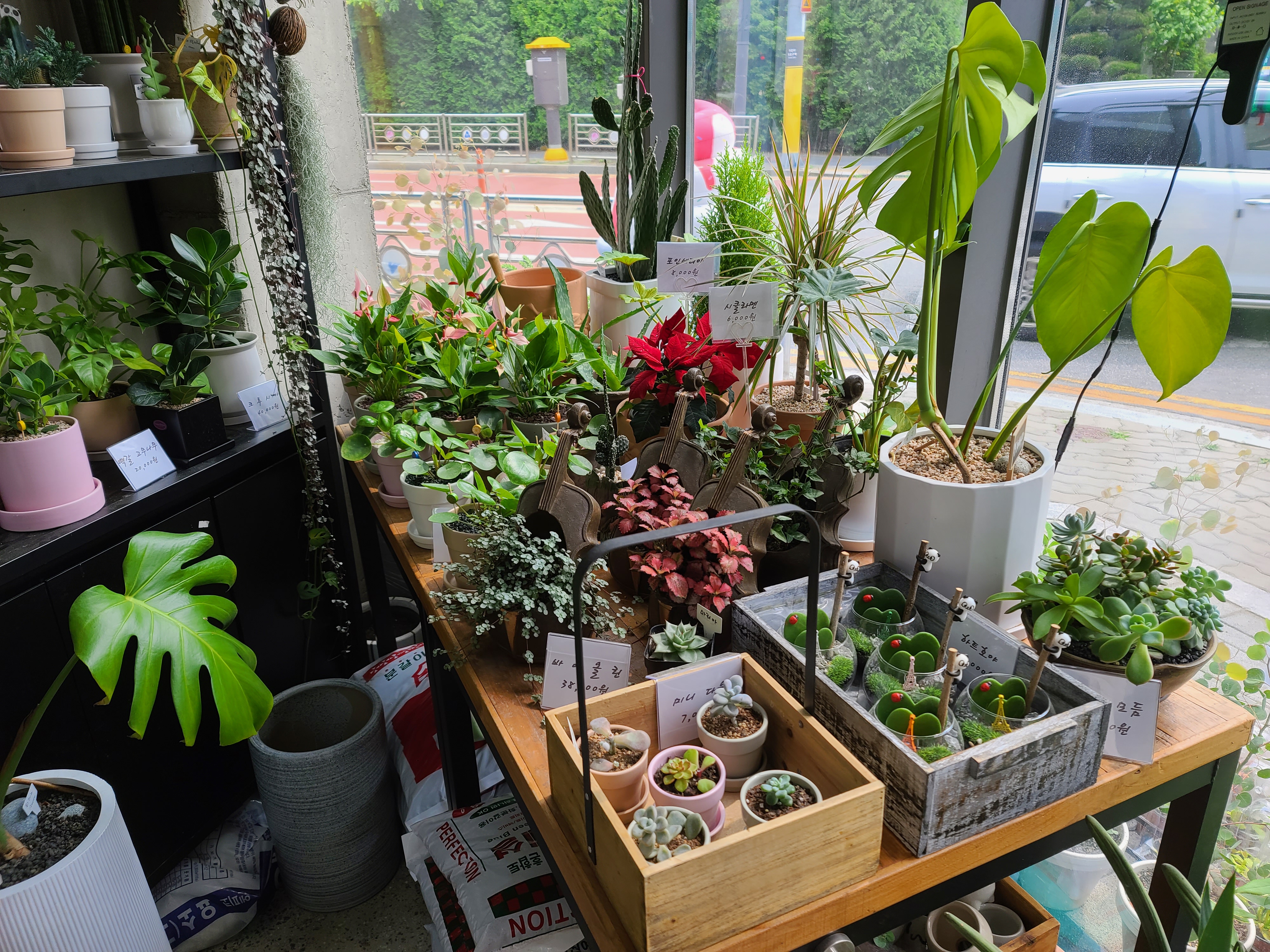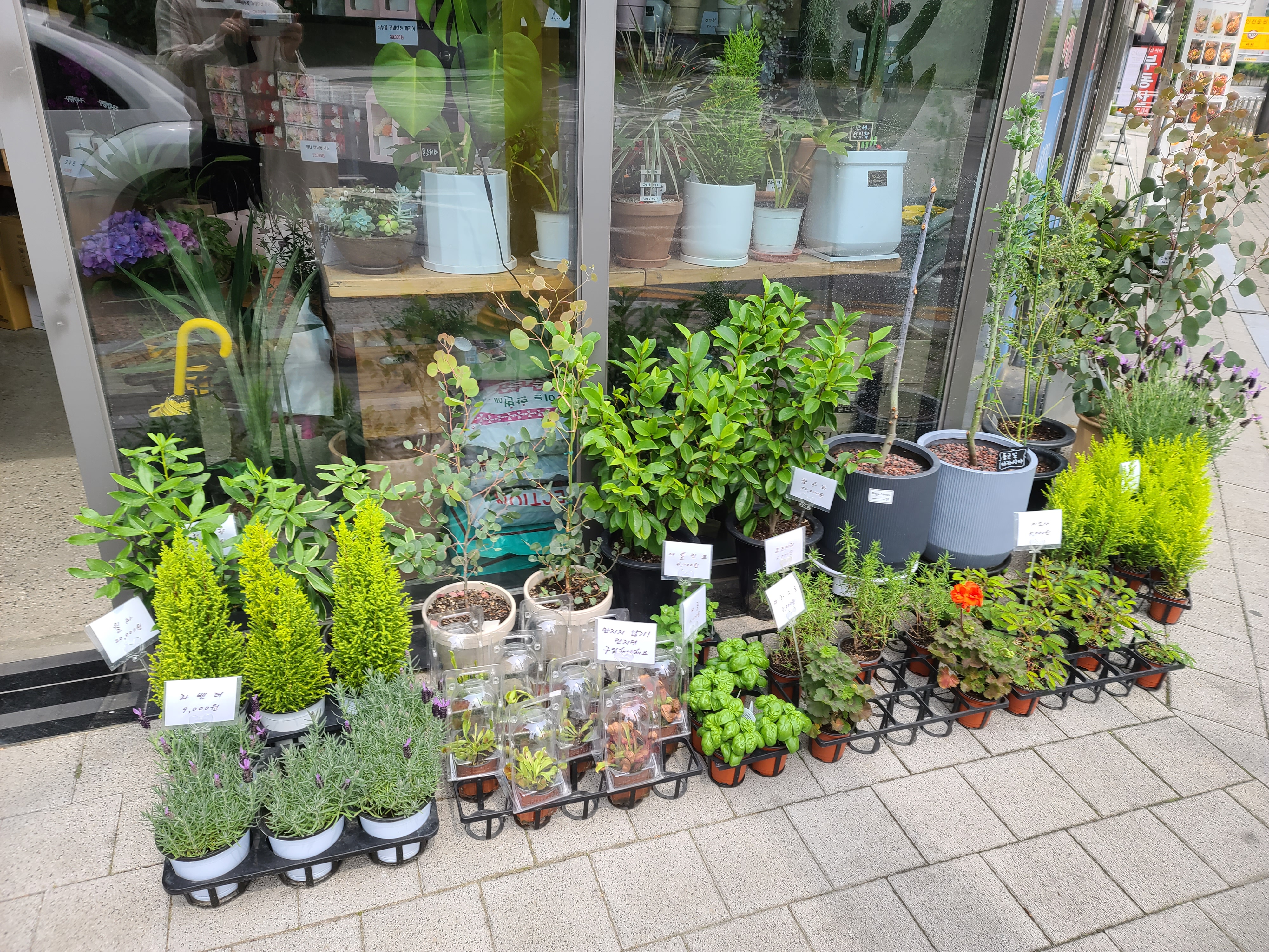 입구에는 화분에 심어져 있는 식물들이 많이 진열되어 있습니다.