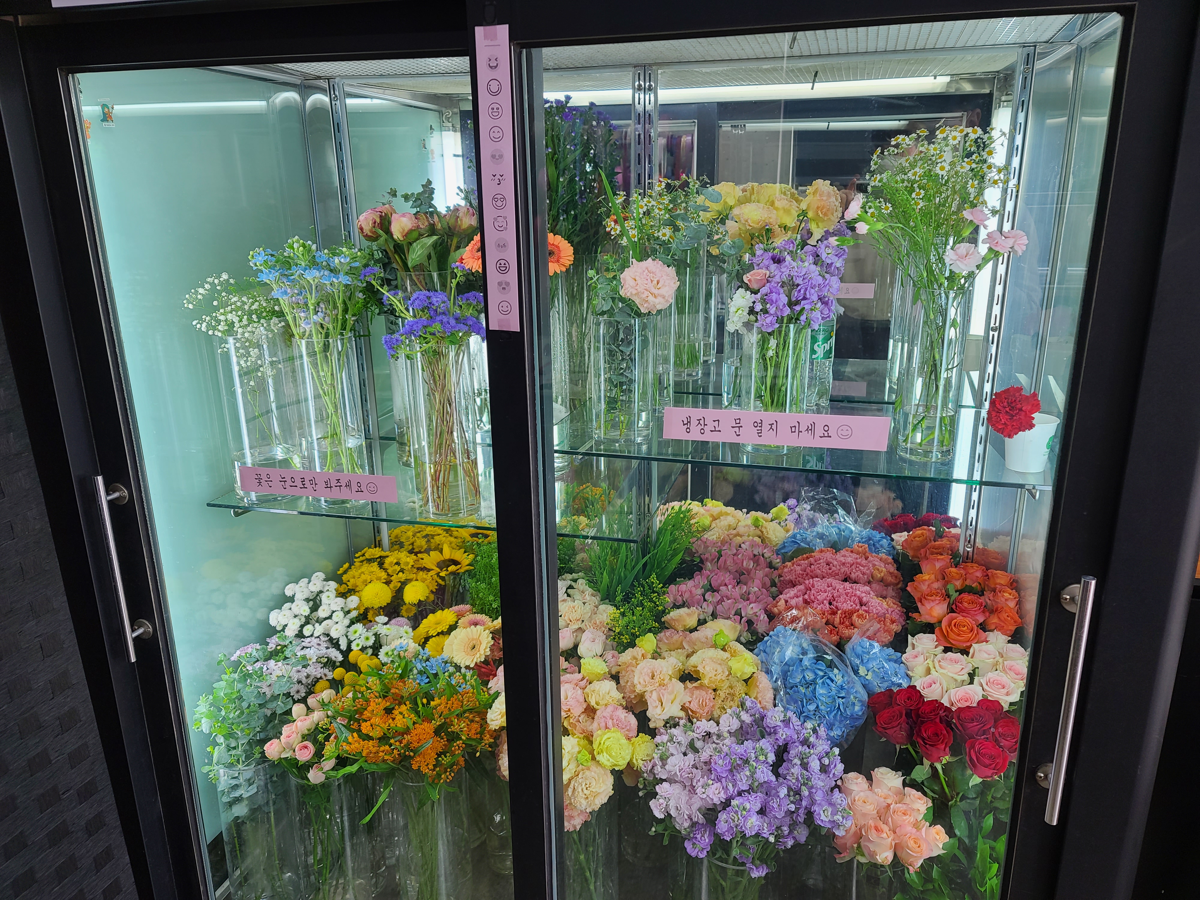 냉장고에 진열되어 있는 꽃다발용 꽃들입니다.