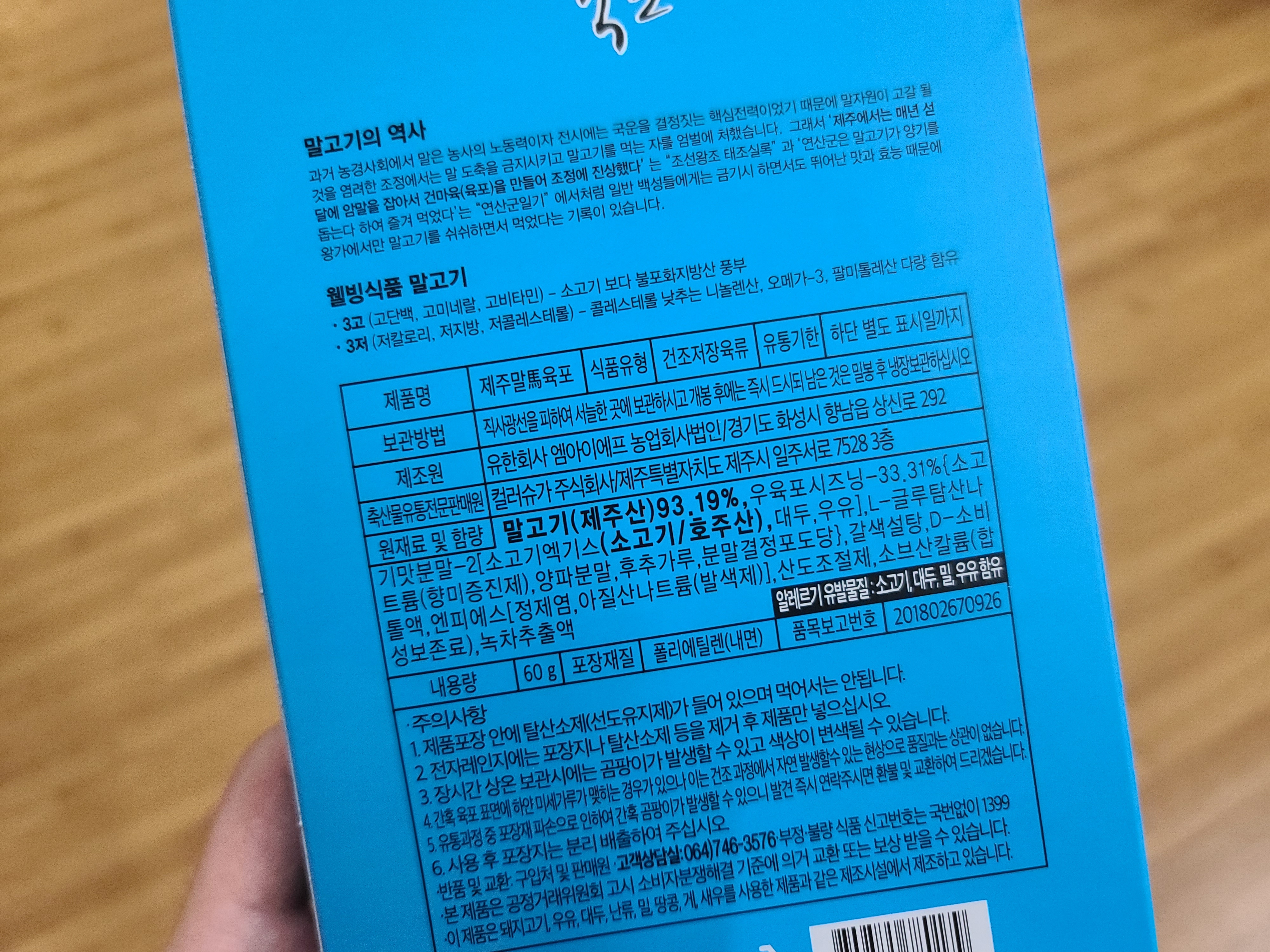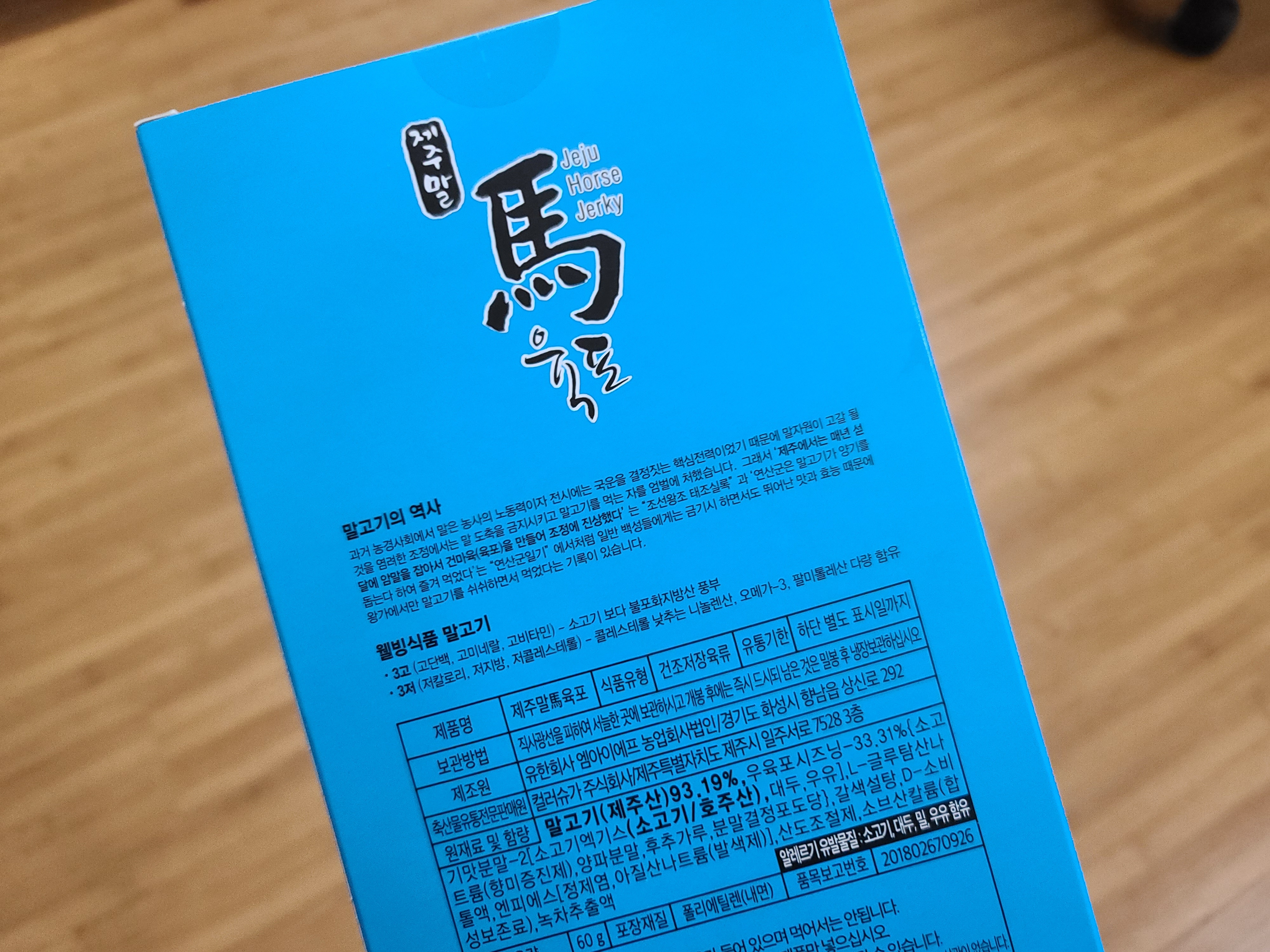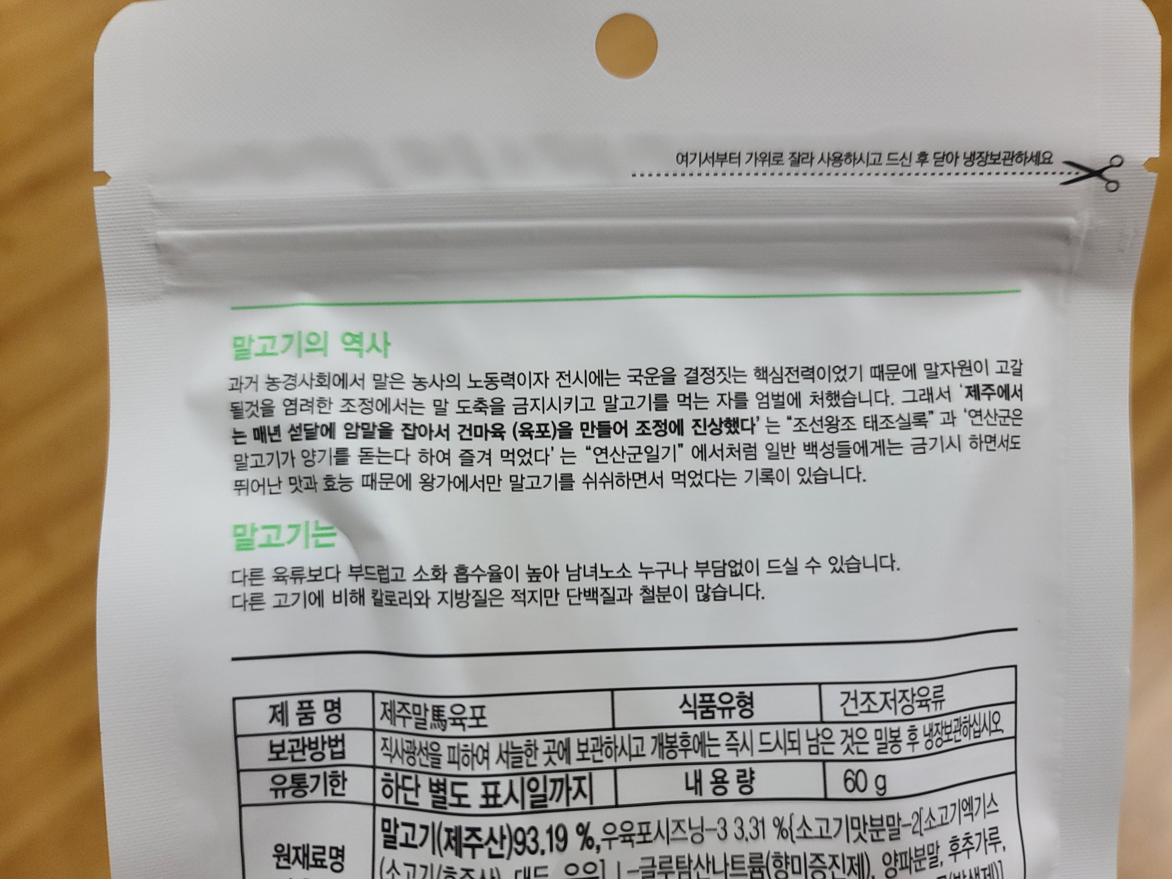제주 말육포 뒷면에는 말고기의 역사와 식품정보가 적혀있습니다.