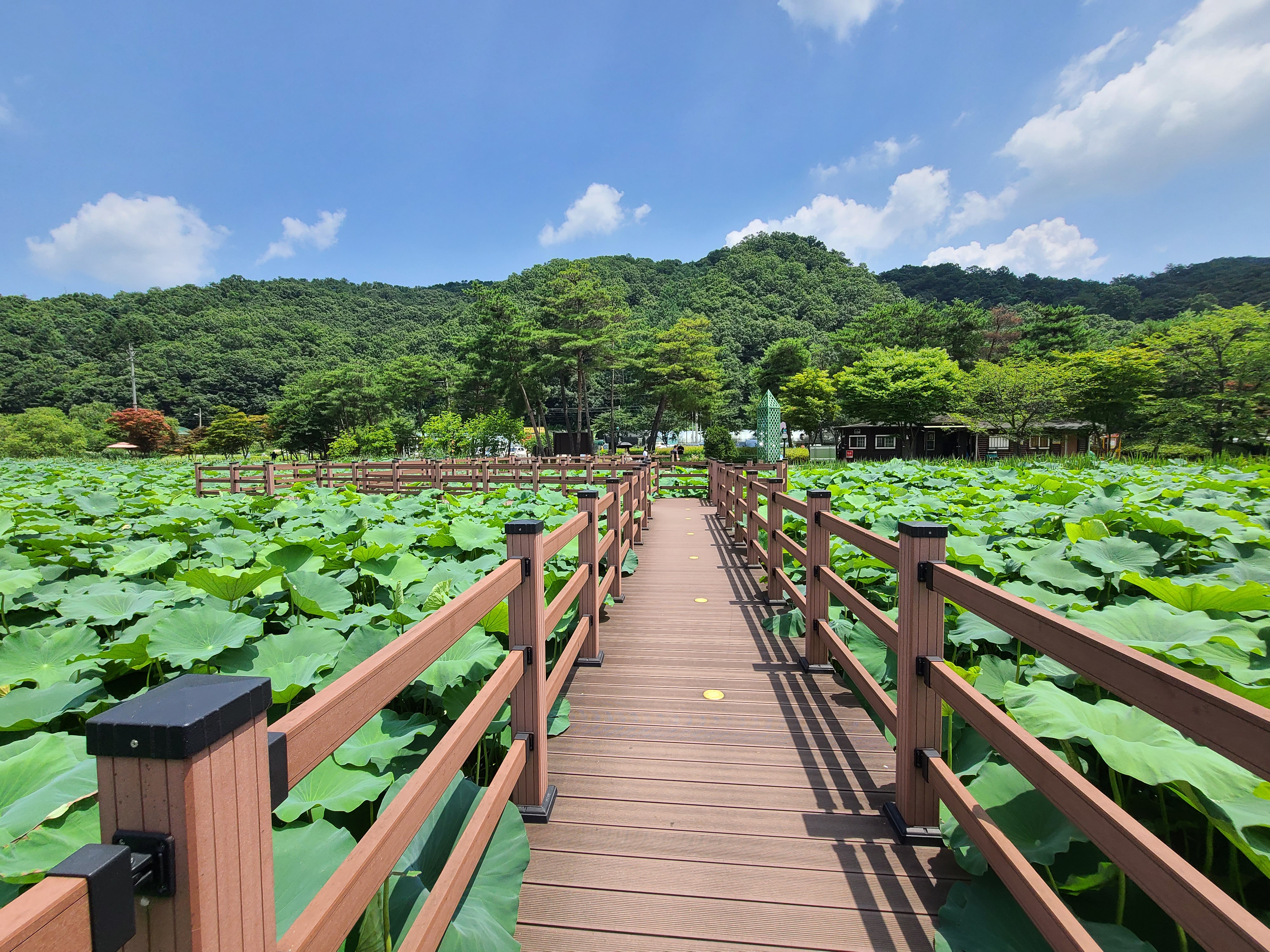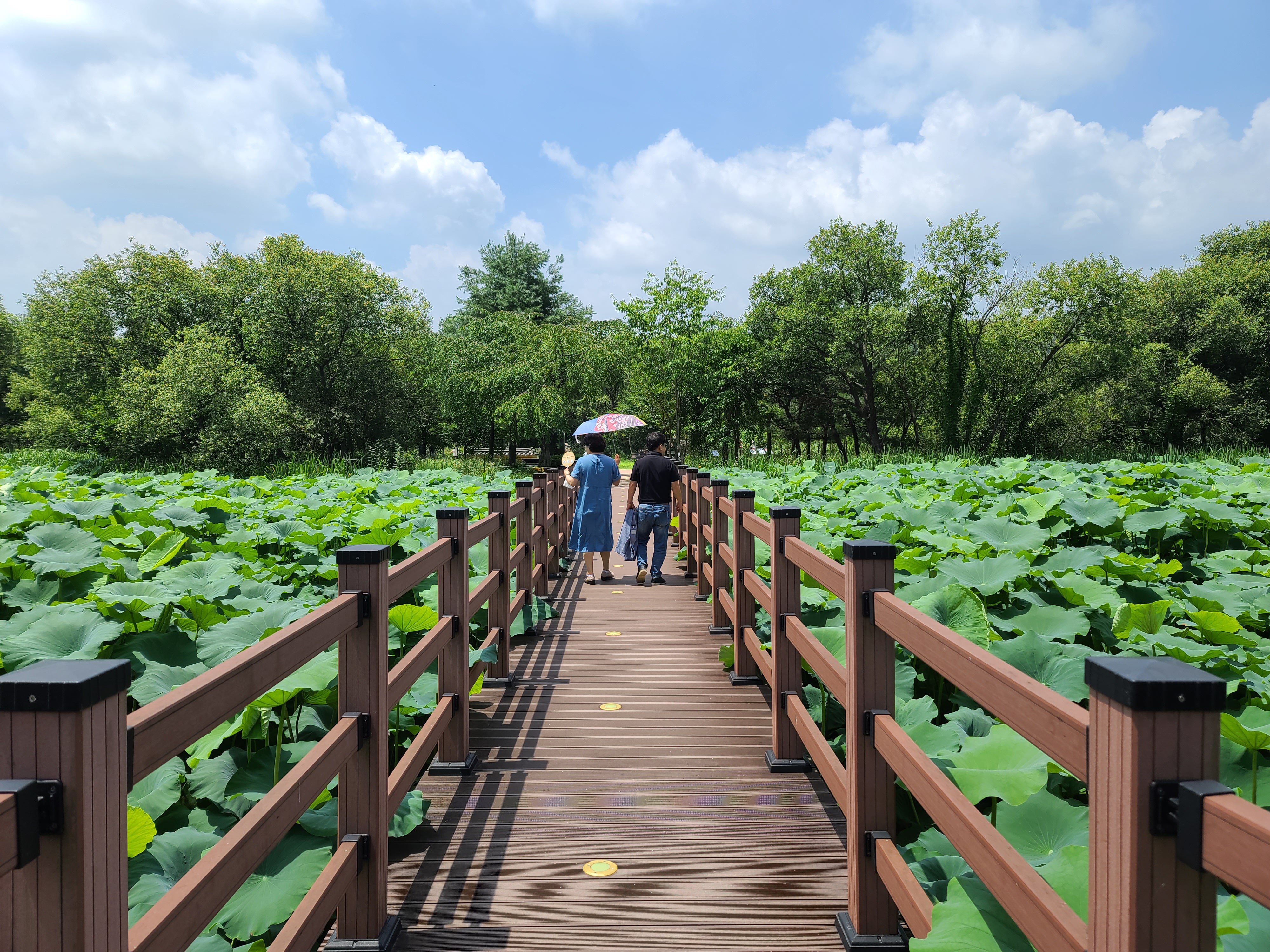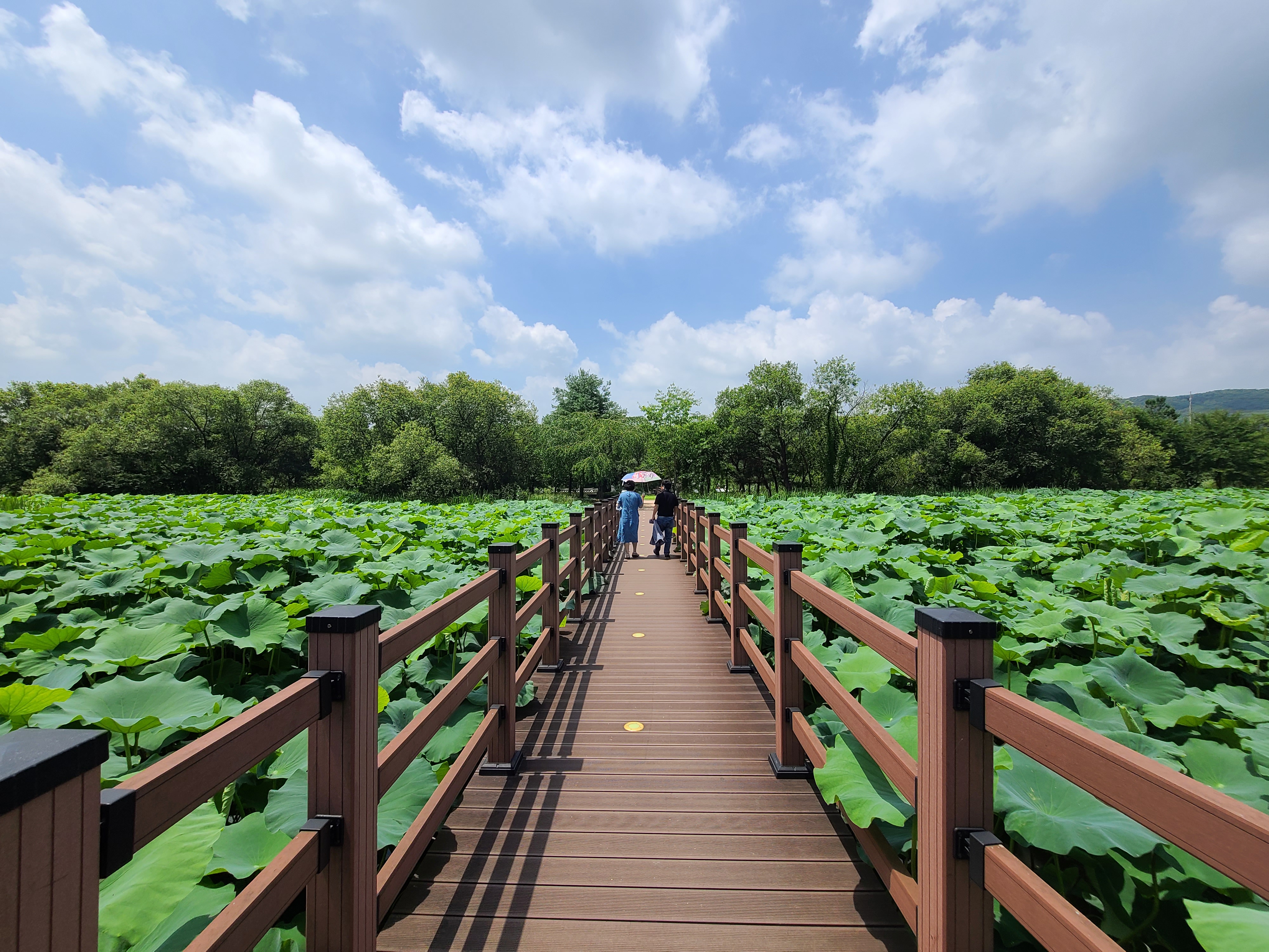 연꽃 습지가 넓게 펼쳐져 있습니다.