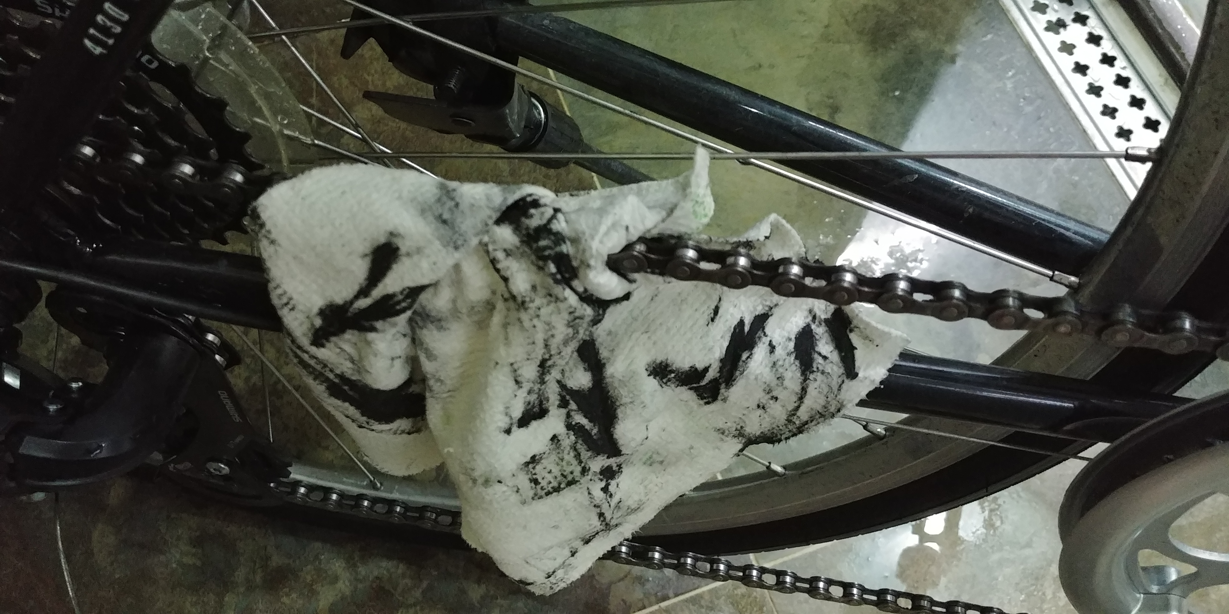 마른 헝겊으로 물기를 제거하면 되는데, 위의 사진을 보시면 체인 클리너를 뿌리고 물로 충분히 헹궜음에도 불구하고 새까만 기름때가 묻어 나오는 걸 보실 수 있습니다.