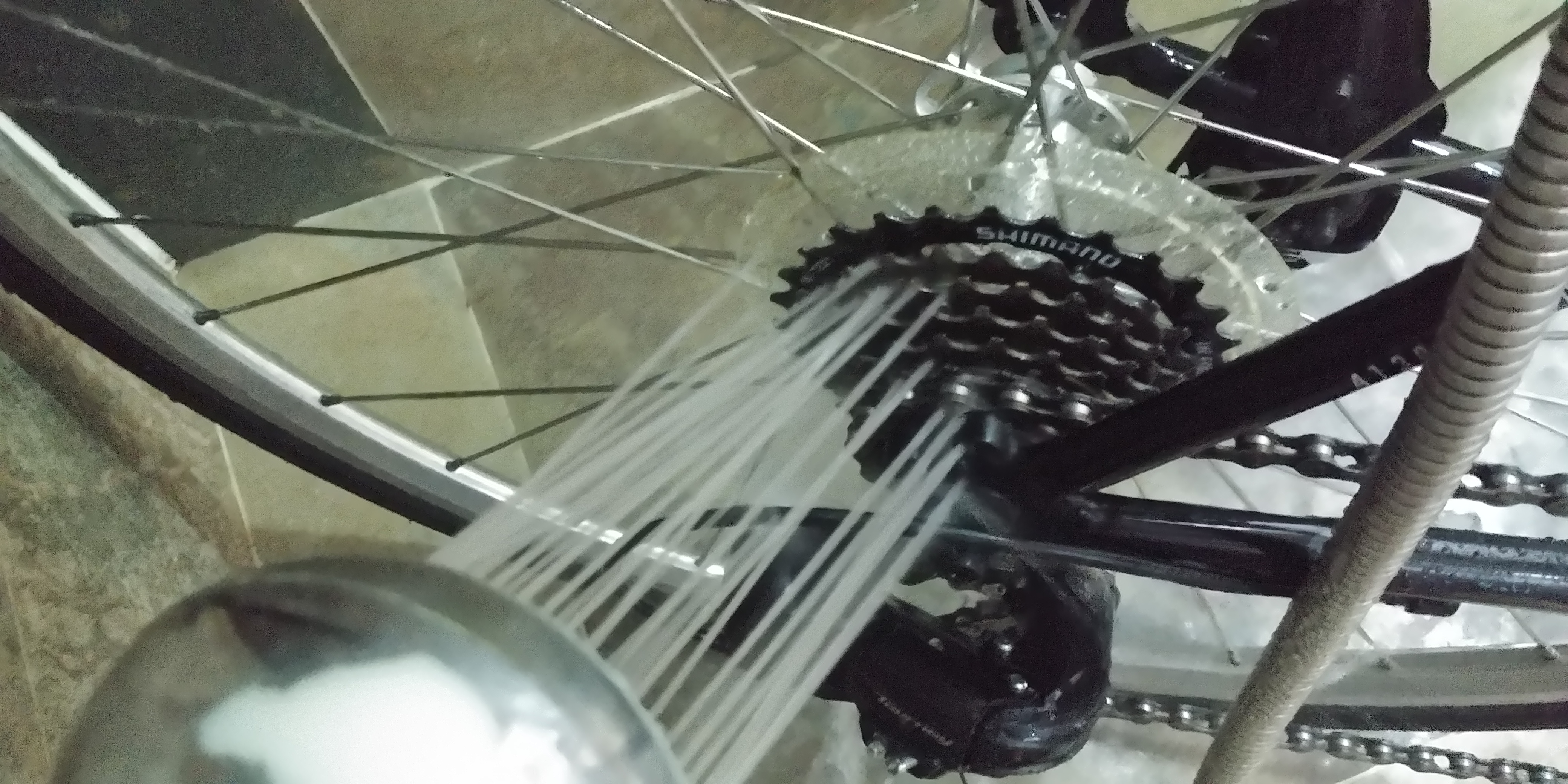 자전거 체인에 다이소 자전거(바이크) 체인 클리너(세정제)를 난사한 사진입니다.