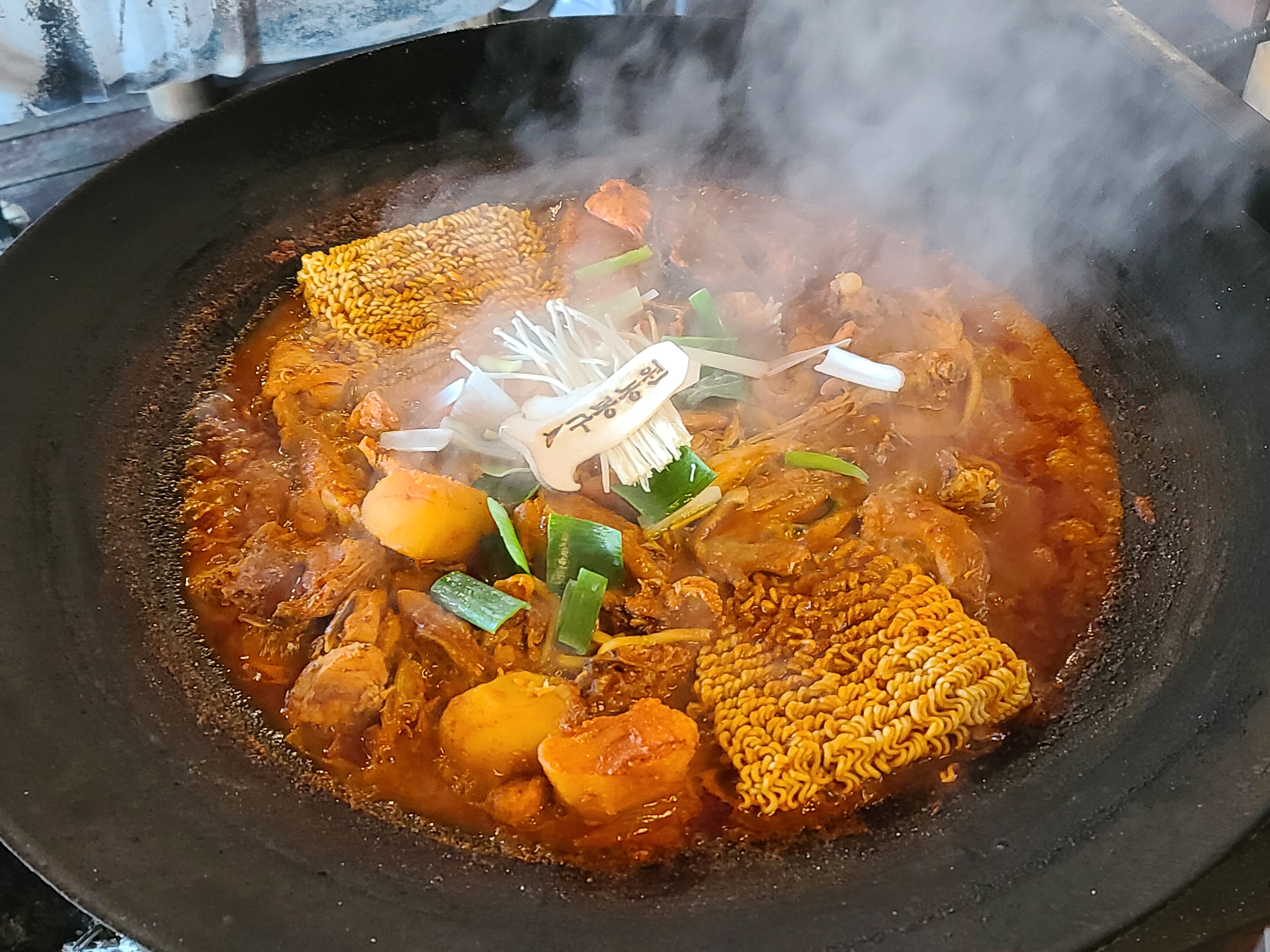 장작 뒤에는 춘천 구봉산 맛집 구봉농원의 대표 메뉴인 솥뚜껑 닭볶음탕이 조리되고 있었습니다.