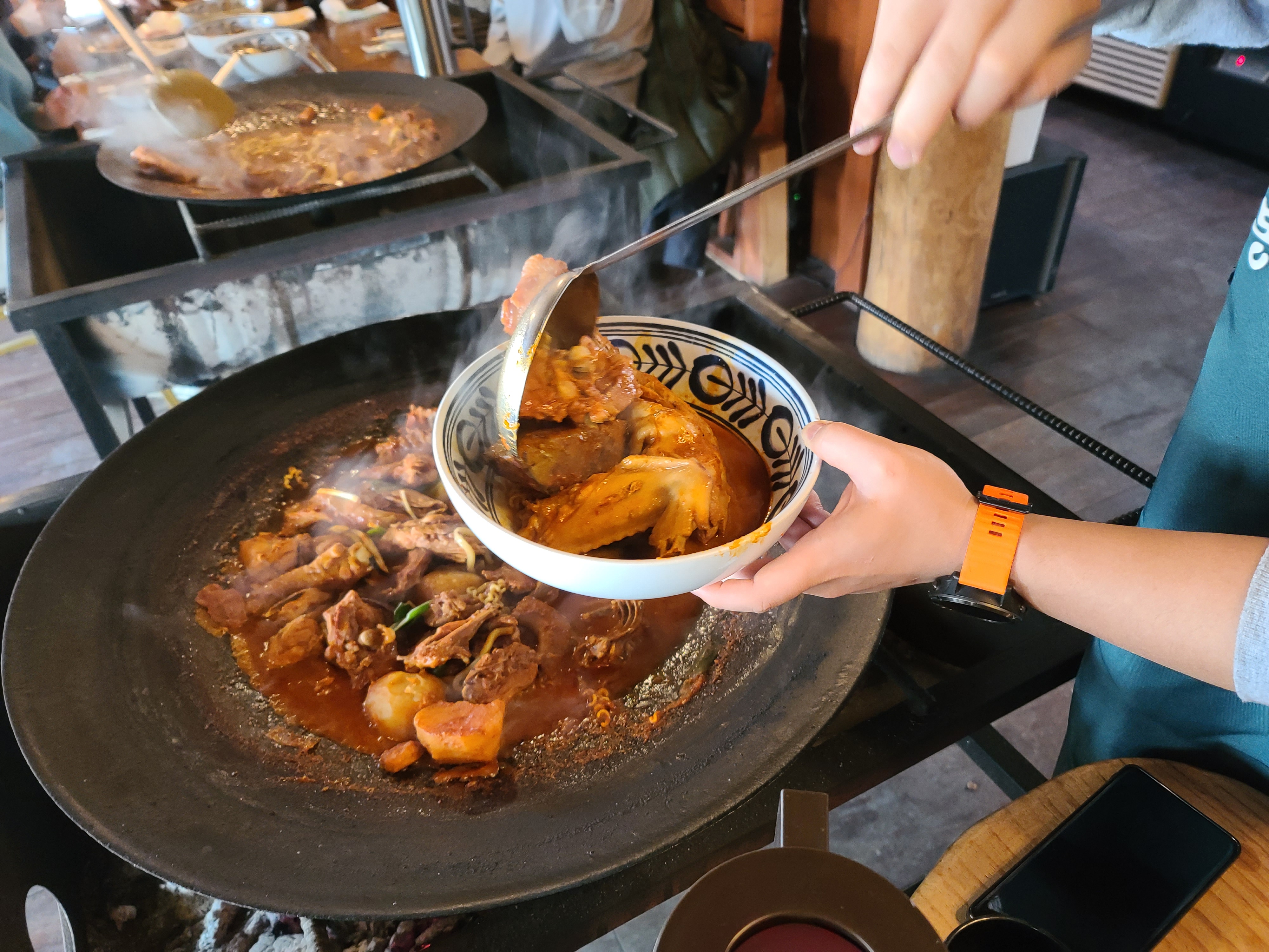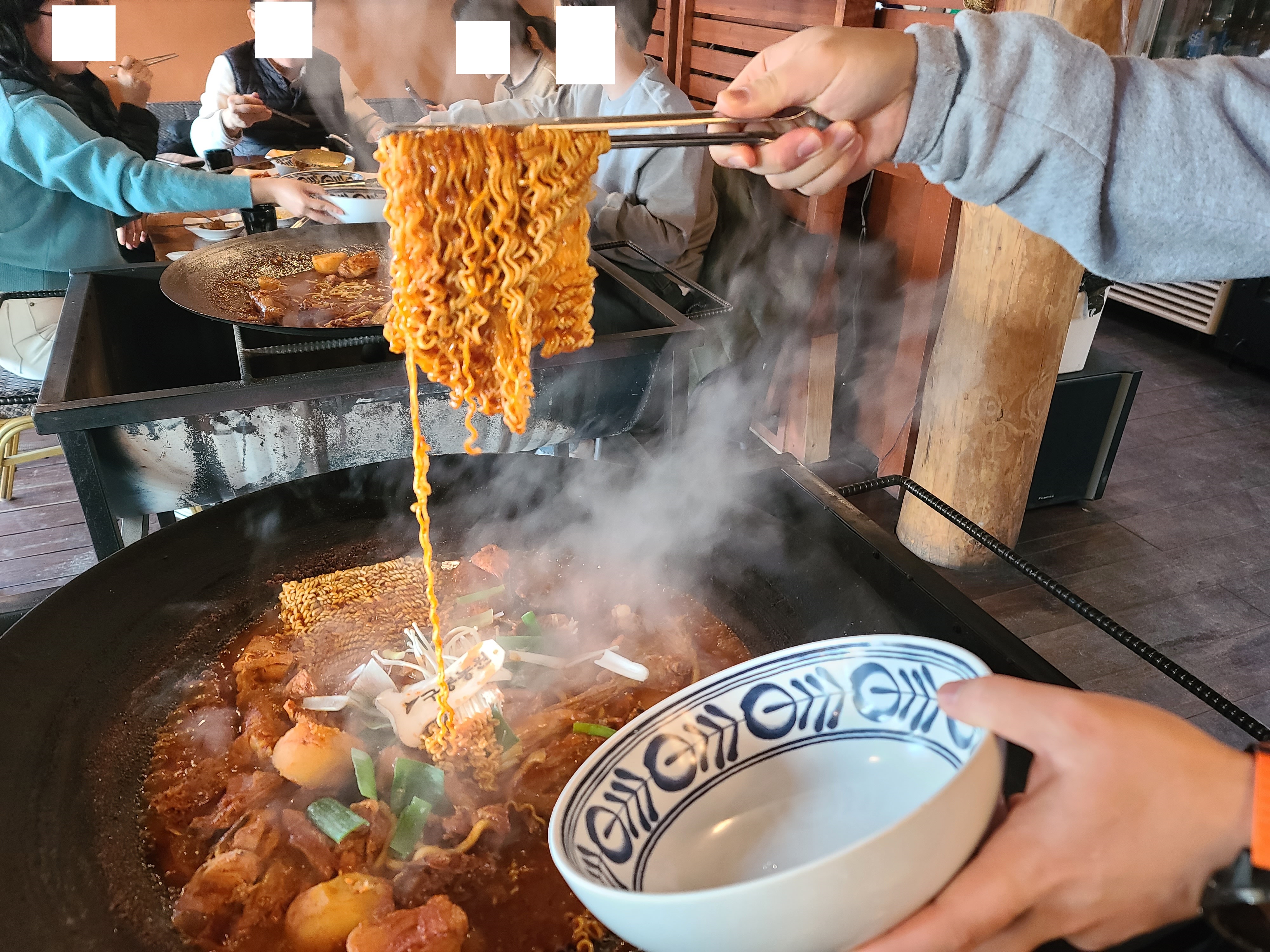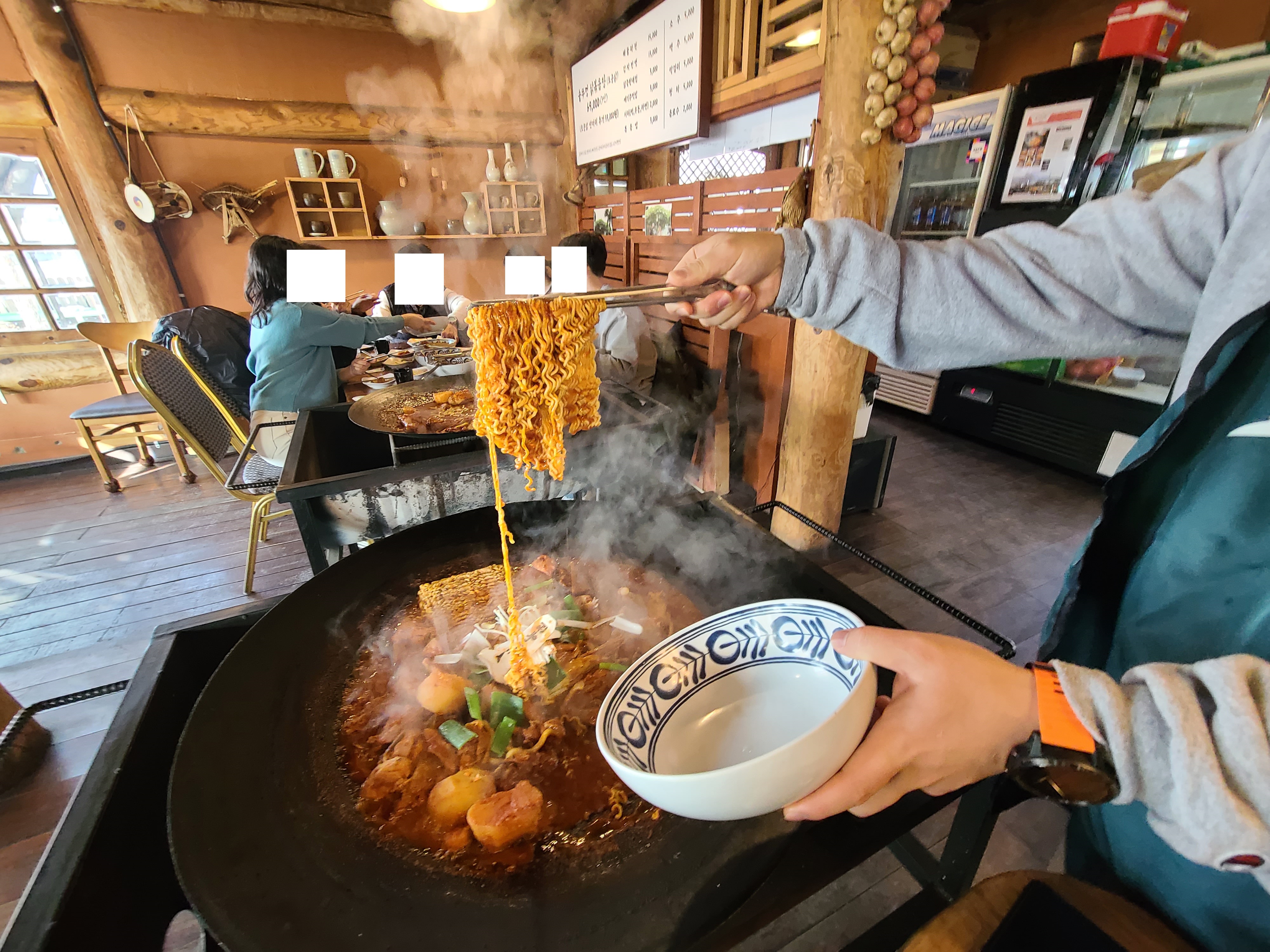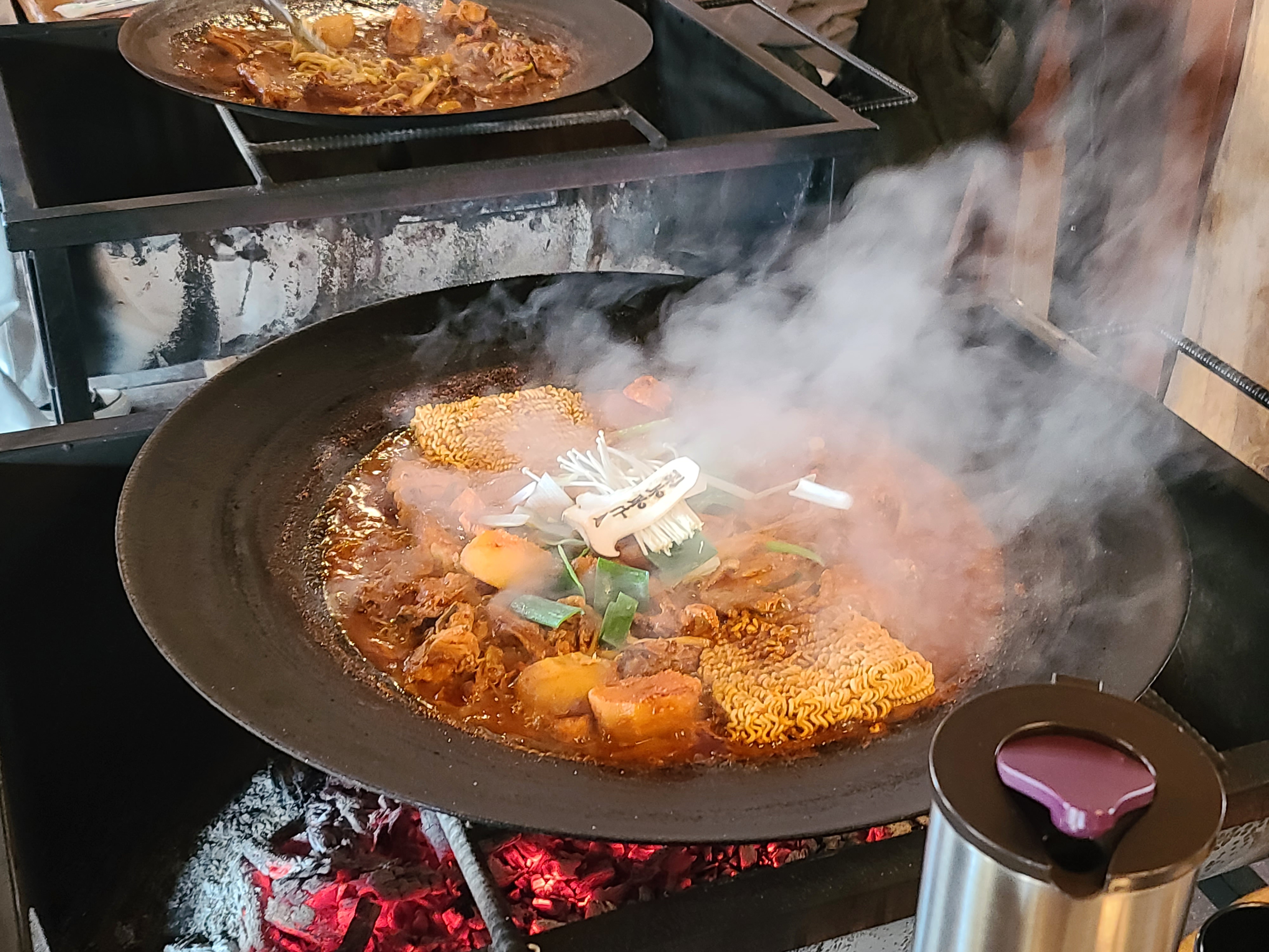 장작 뒤에는 춘천 구봉산 맛집 구봉농원의 대표 메뉴인 솥뚜껑 닭볶음탕이 조리되고 있었습니다.