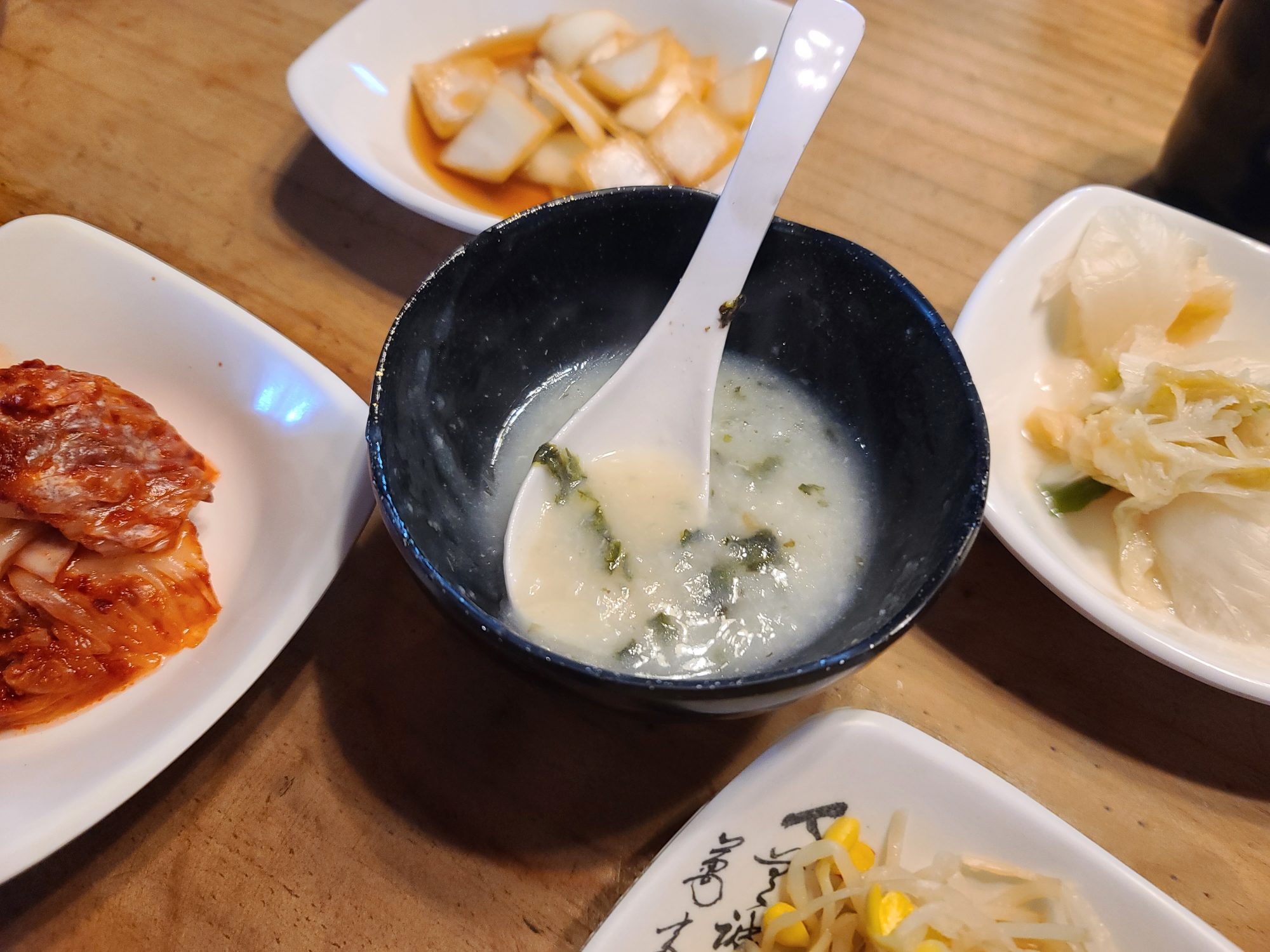김치, 물김치, 콩나물, 깍두기, 양파 짱아찌가 밑반찬으로 나왔고 식전음식으로 닭죽이 나왔습니다.