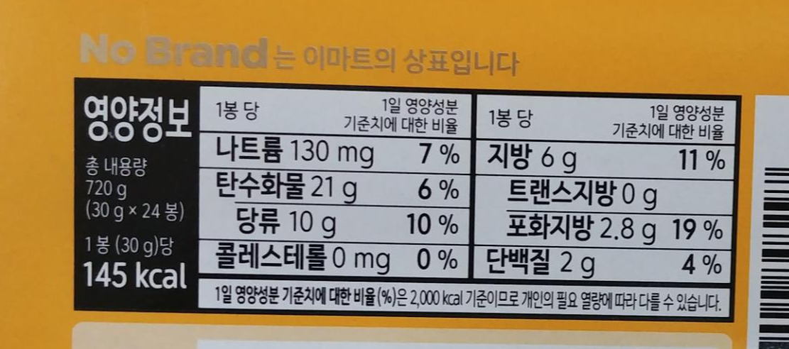 다음으로는 노브랜드 쿠키 앤 크림샌드의 영양정보를 살펴보도록 하겠습니다. 다른 과자와 마찬가지로 1 봉지를 기준으로 하는 영양정보가 쓰여있습니다. 한 봉지당 30g밖에 안되기 때문에 확실히 영양정보 비율도 낮은 것 같습니다. 하지만 칼로리는 145kcal로 몸무게에 신경을 쓰시는 분들이라면 주의하셔야 합니다.