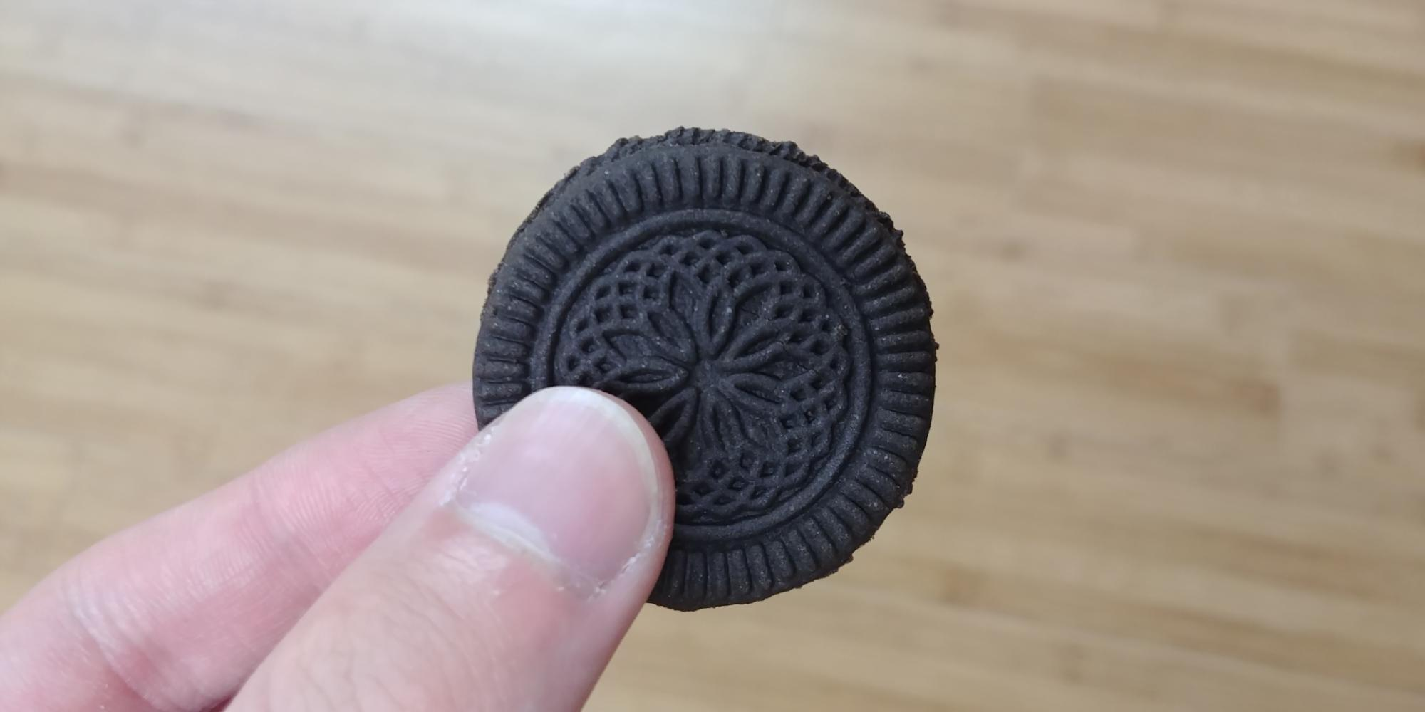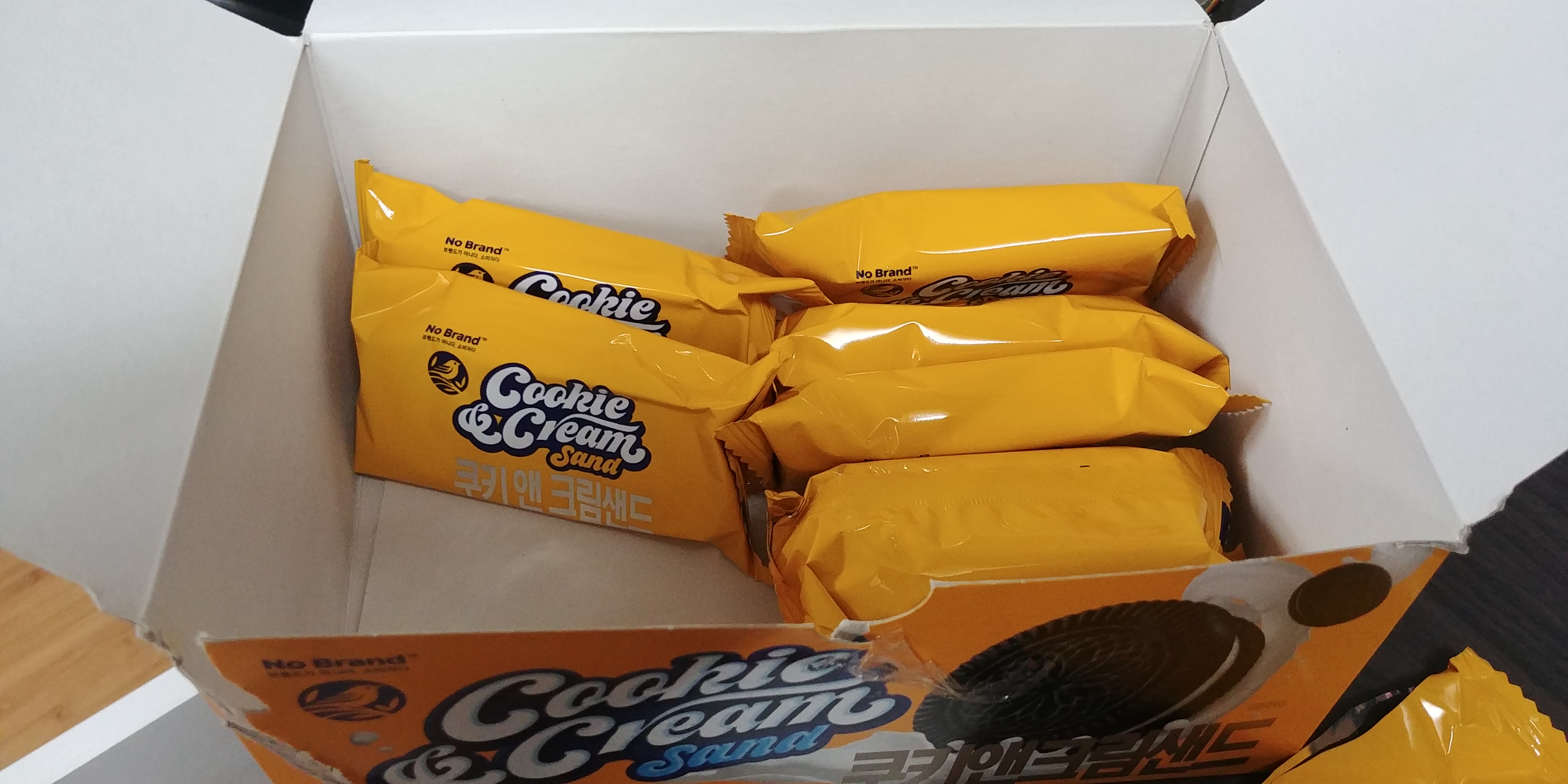 노브랜드 쿠키 앤 크림샌드의 실물 사진입니다. 위에서 봤을 때에는 보통 샌드류 과자와 크기가 비슷합니다. 하지만 두께로 따진다면 다른 샌드류 과자에 비해서 훨씬 작습니다. 약 2배가량 두께가 차이 나는 것 같습니다. 오레오는 일부러 색다른 식감을 위해서 오레오 씬즈를 출시하기도 했습니다. 하지만 노브랜드 쿠키 앤 크림샌드는 그냥 가성비를 맞추기 위해서 얇게 만든 것 같습니다. 드셔 보시면 아시겠지만, 뭔가 맛을 위해서 얇게 만든 것이 아니라 그냥 단가를 낮추기 위해서 얇게 만들었다는 느낌이 확 듭니다.
