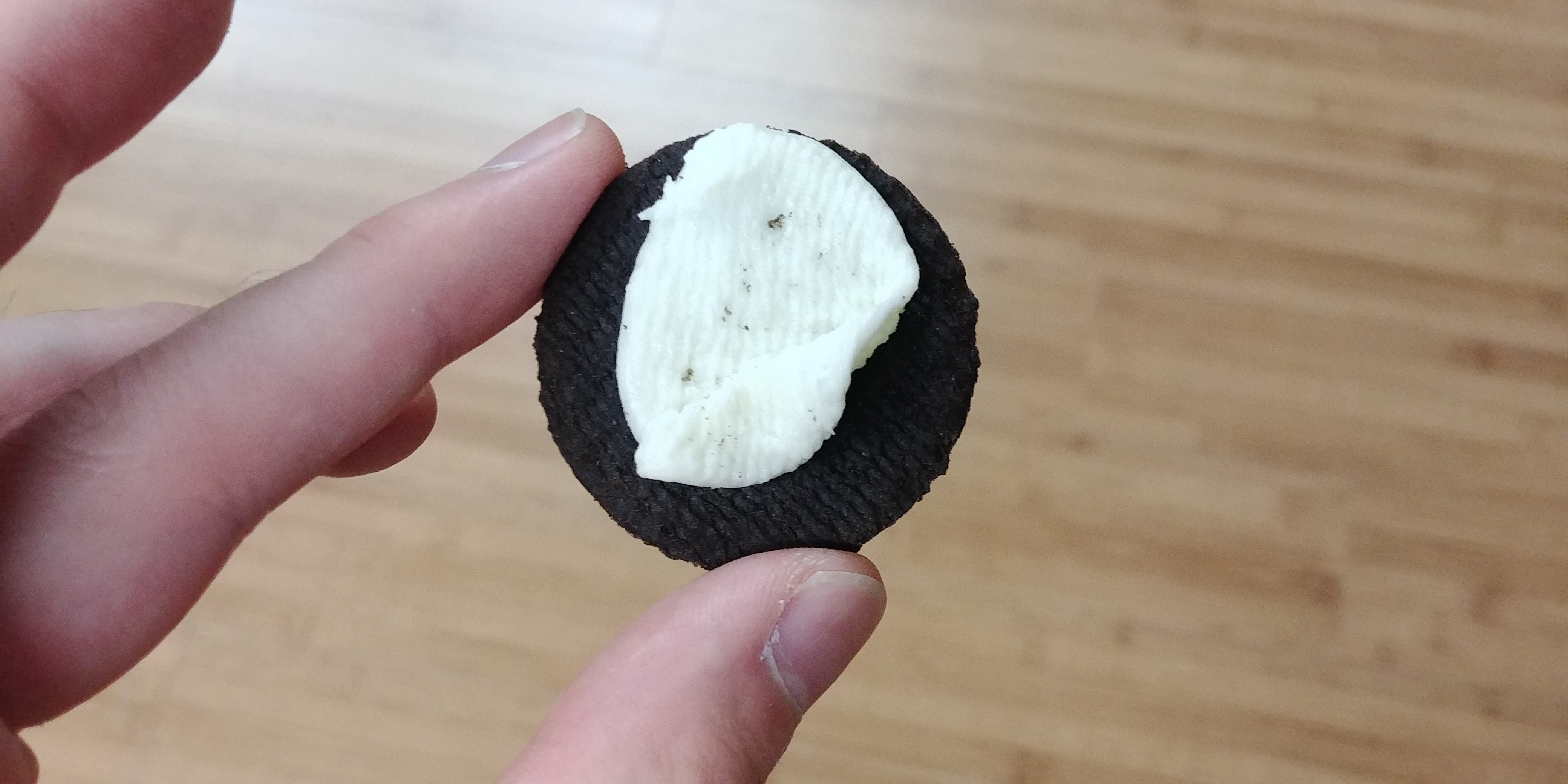 샌드류 과자를 드셔보신 분은 아시겠지만, 위의 사진과 같이 과자의 윗부분과 아랫부분을 분해하여 먹지 않으면 뭔가 아쉽기 때문에 저도 한 번 해봤습니다. 그런데 다른 샌드류 과자와는 다르게 쿠키와 크림이 이상하게 분리됩니다. 원래는 샌드류 과자를 분리했을 때에는 완벽히 크림이 있는 쿠키와 없는 쿠키로 분리되거나 두 쿠키에 모두 크림이 묻어있게 분리되곤 합니다.