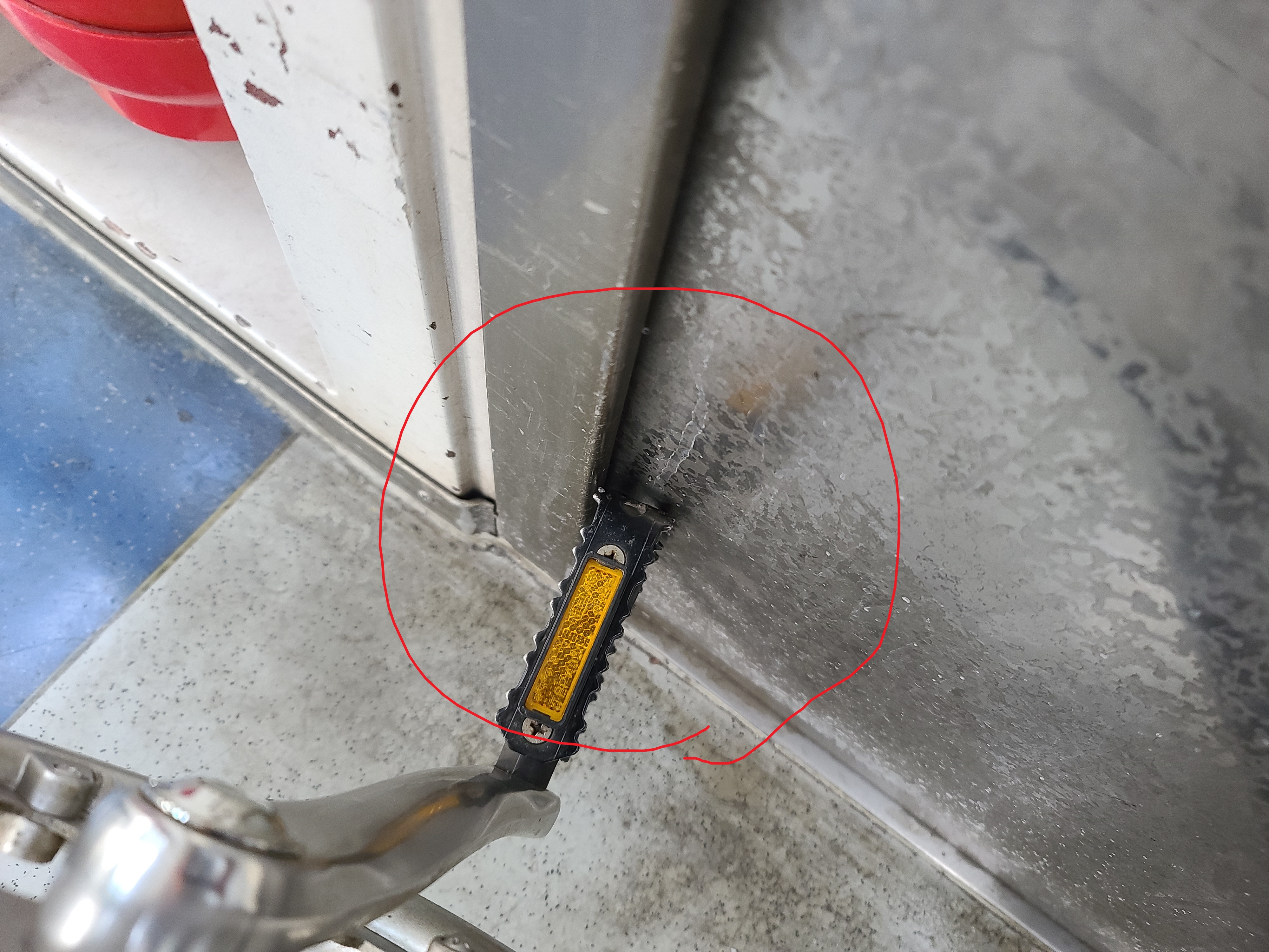 다음으로는 자전거 페달을 저 문틈 사이에 끼워줄 것입니다.