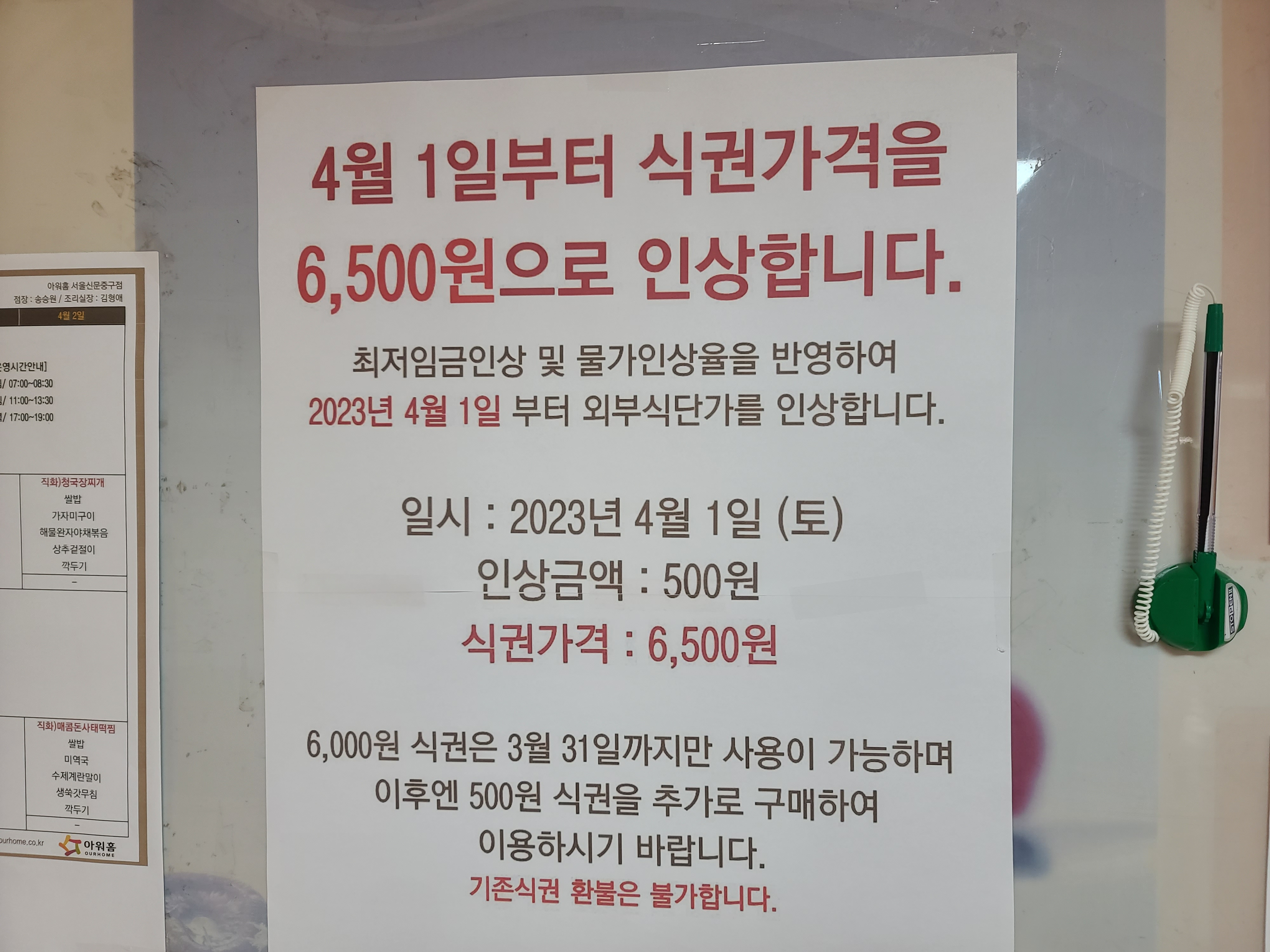 식권 가격이 4월 1일부터 6,500원으로 기존 6,000원에서 500원이 인상됩니다.
