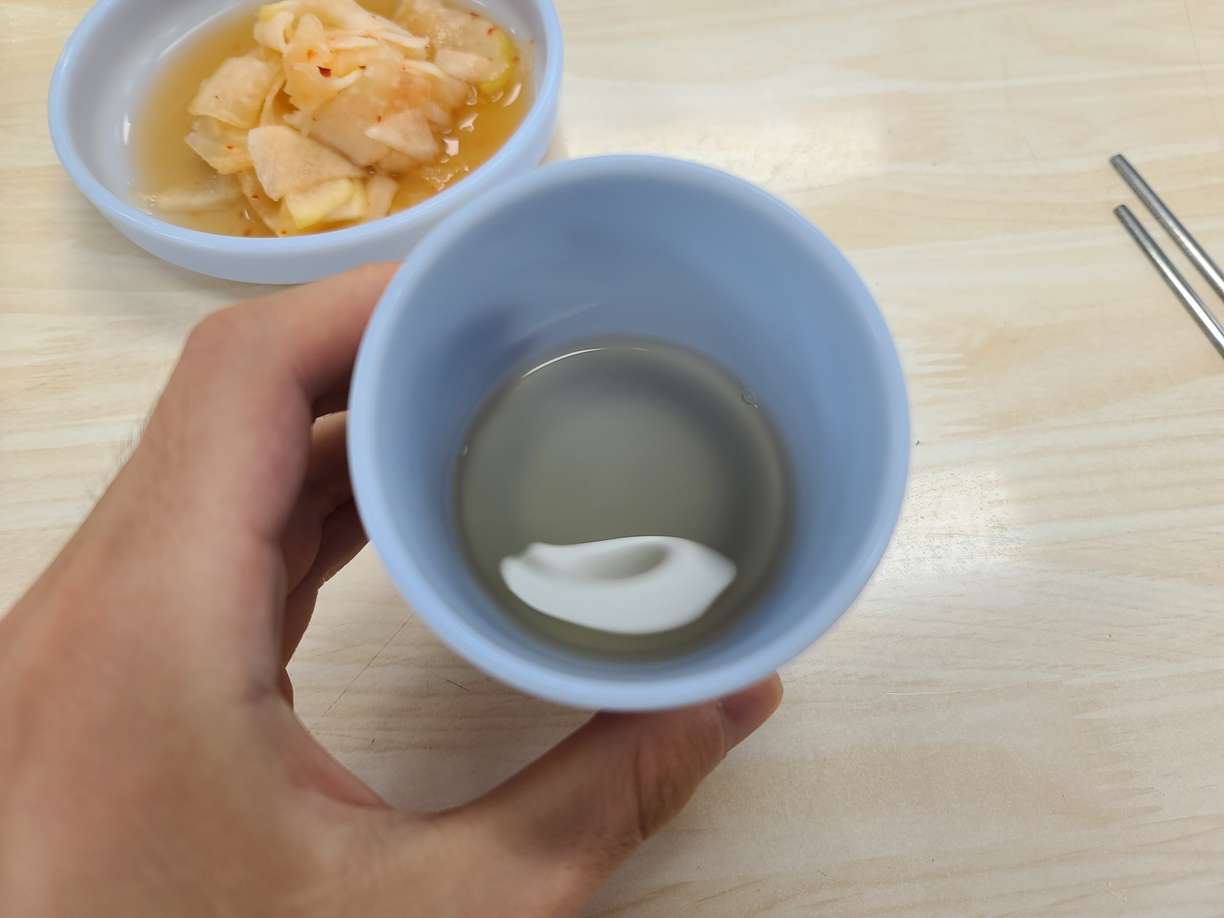 막국수가 나오기 전까지 기다리기 심심해서 육수를 컵에 따라 조금 마셔봤습니다.