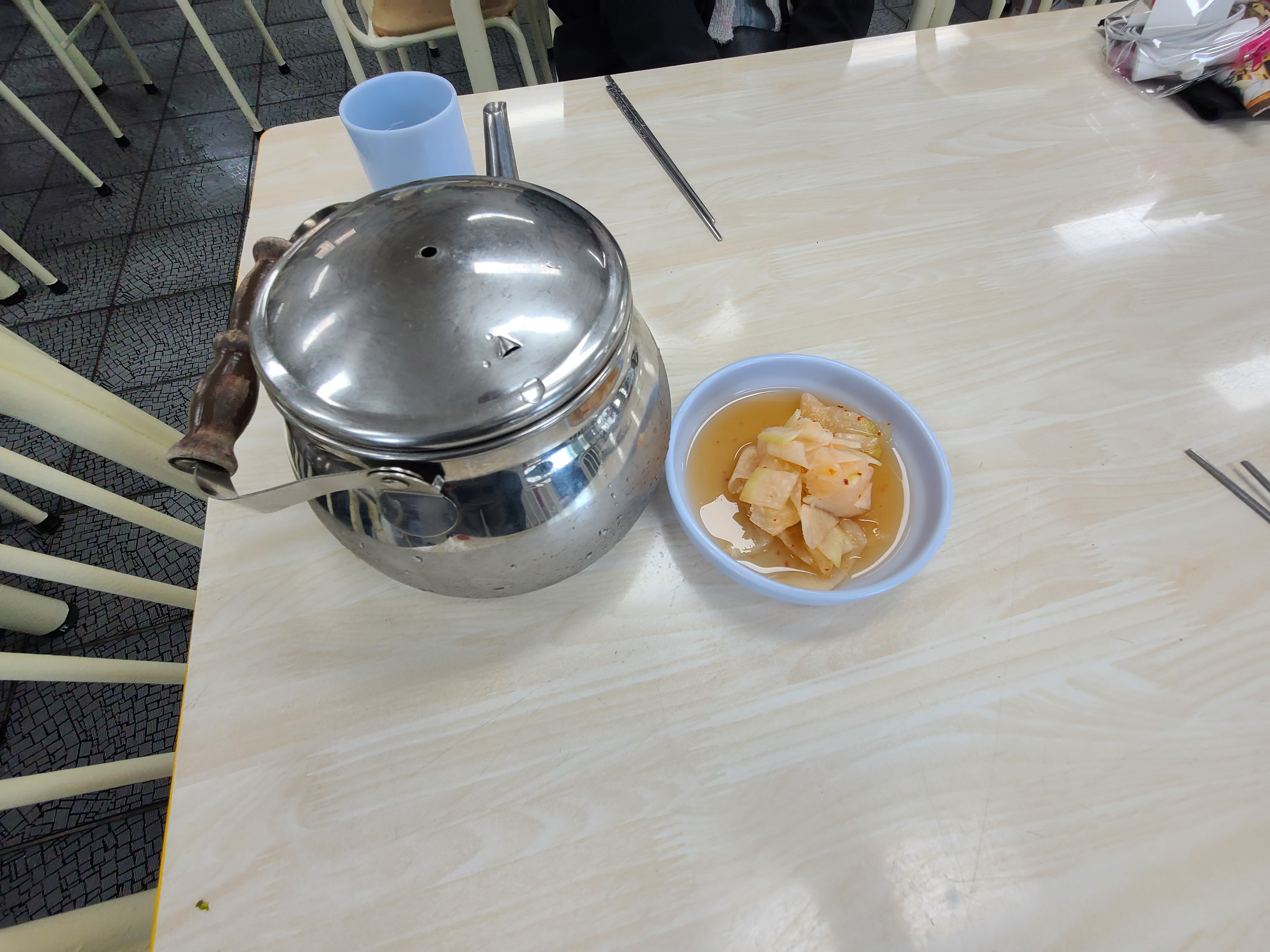 자리에 앉으면 이렇게 주전자에 들어있는 막국수 육수와 무김치를 가져다주십니다.