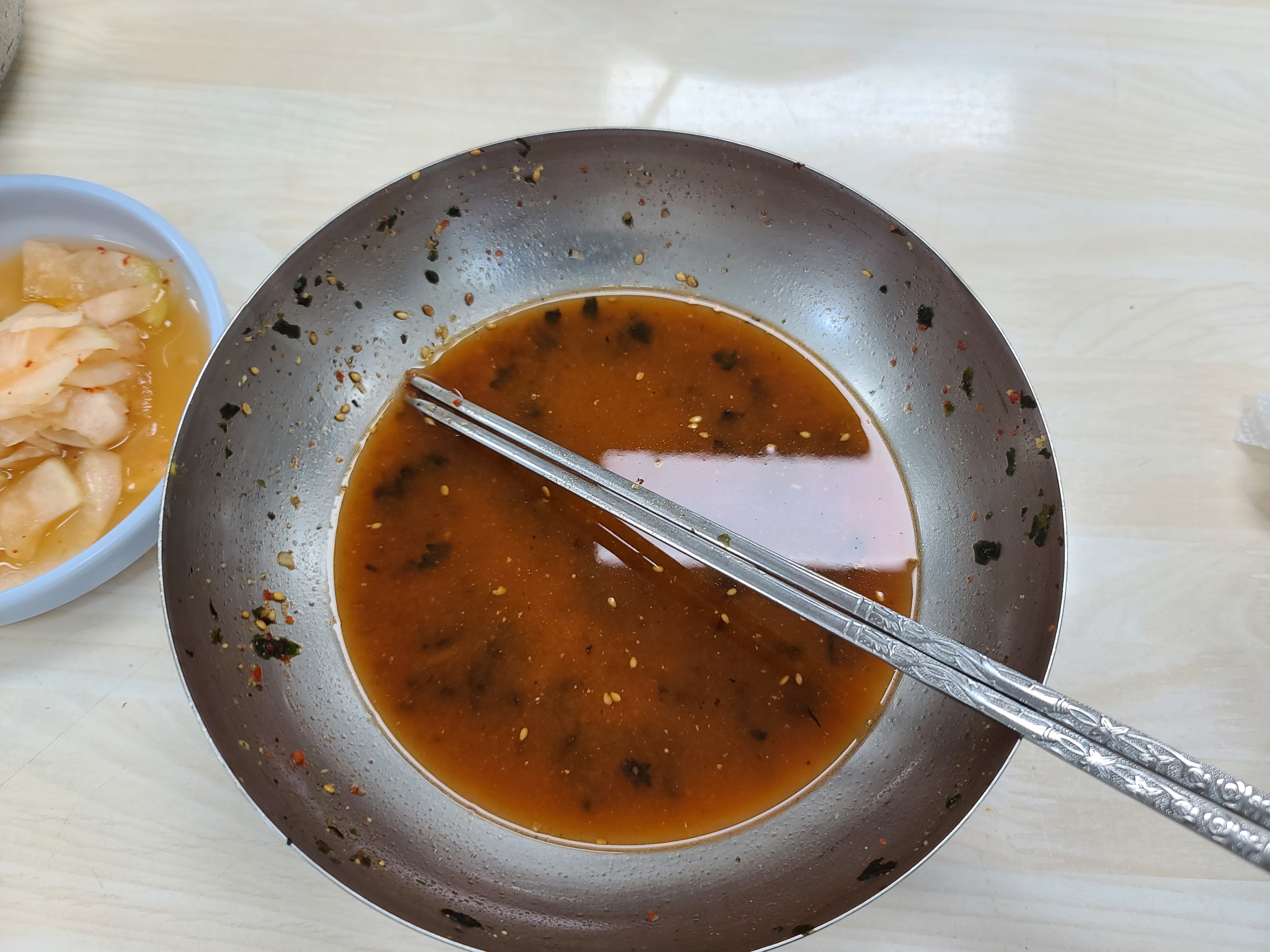 먹어보니 말린 생선(황태 등)을 끓여서 만든 육수 맛이 나더군요.