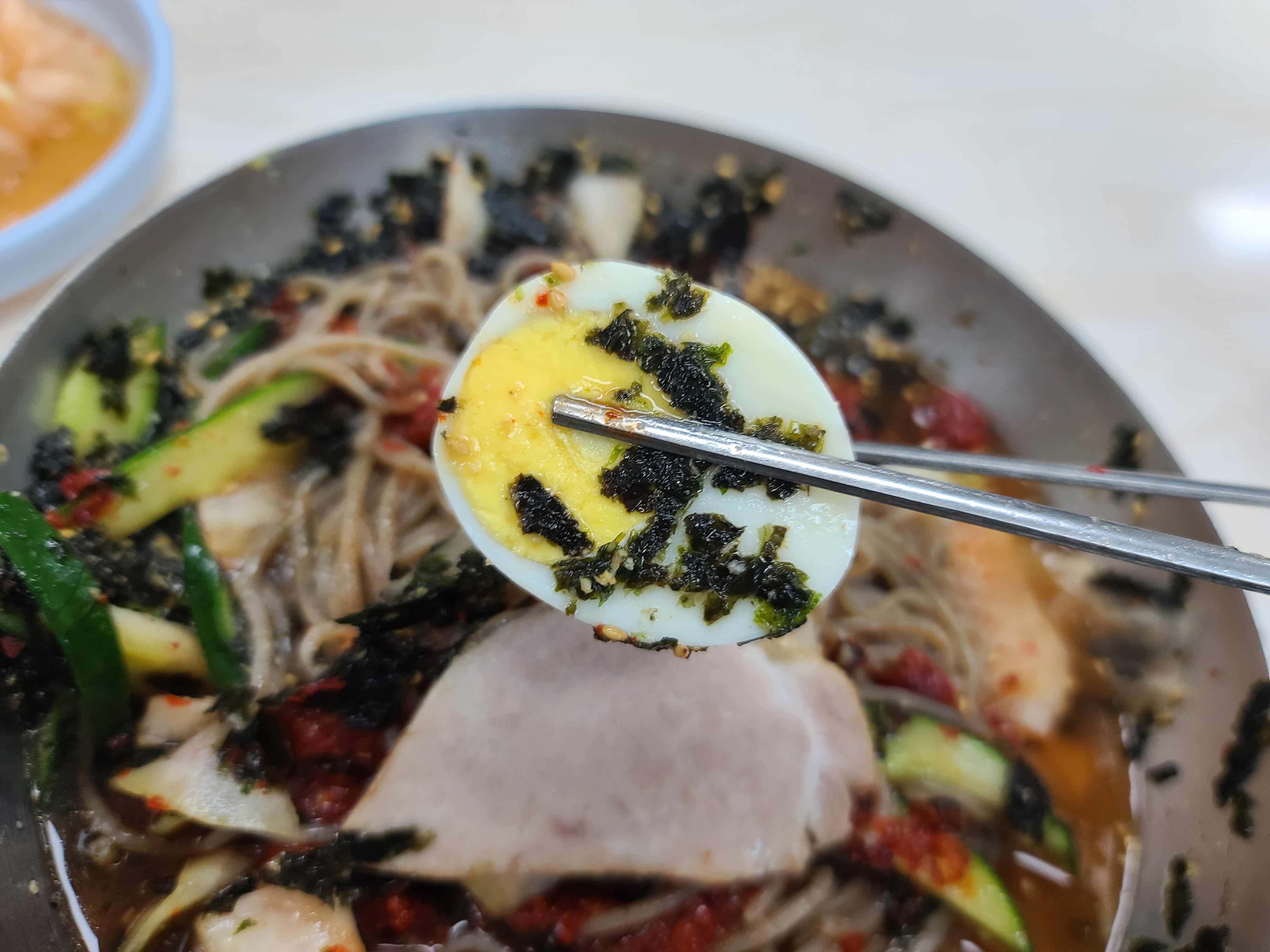 막국수의 고명으로는 얇게 저민 고기 한점과 삶은 계란 반개가 올라가있었습니다.