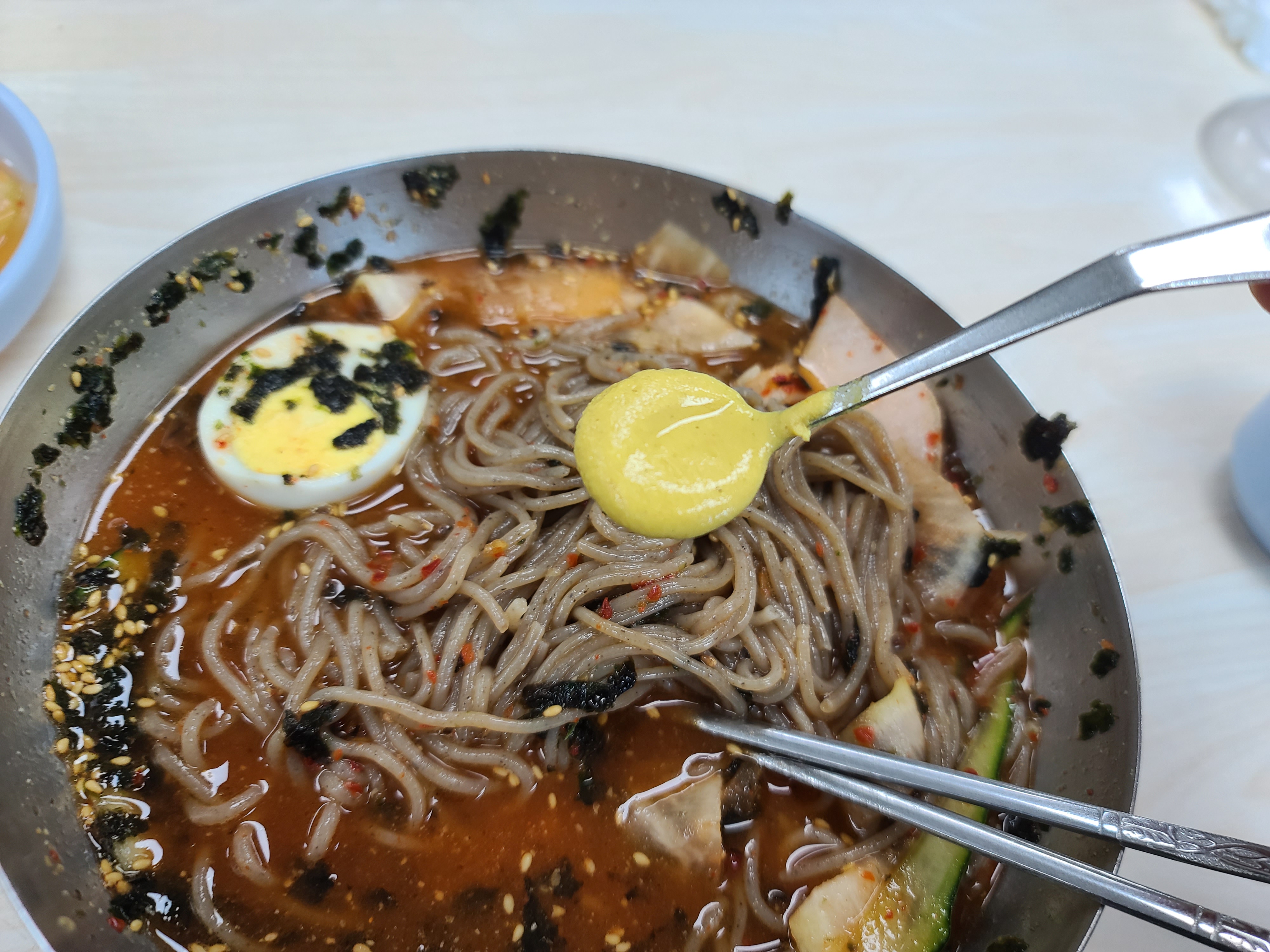 겨자와 식초를 넣으니 확실히 여름에 많이 먹는 시원한 냉면의 맛이 더 느껴지더군요.