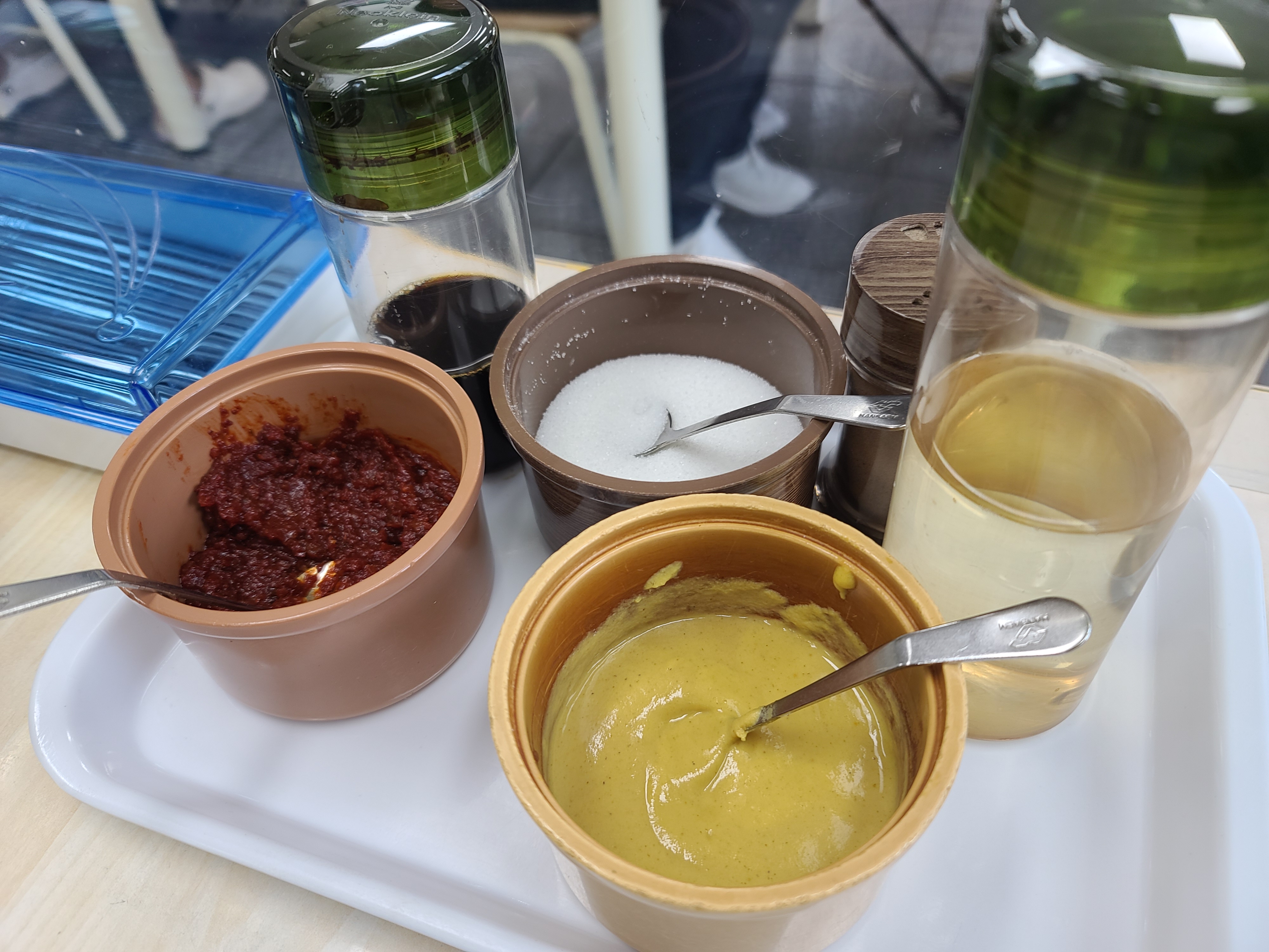 다데기와 간장, 설탕, 겨자, 식초, 후추가 구비되어 있었습니다.