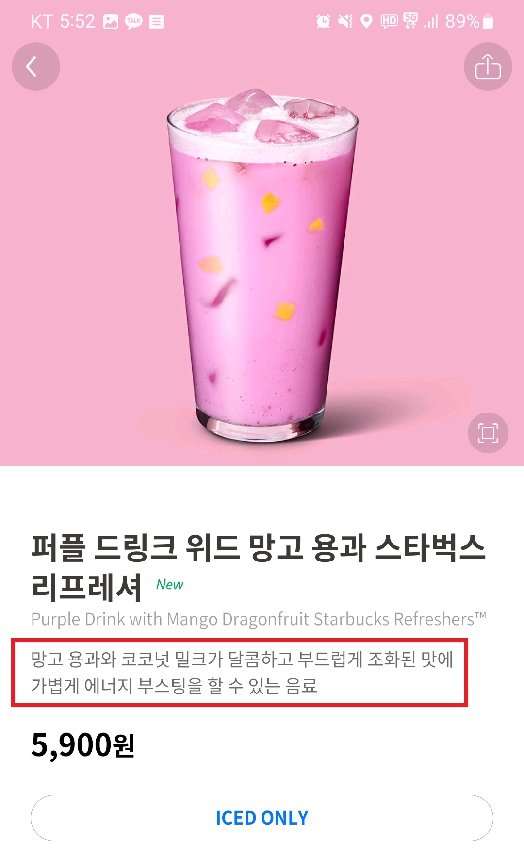 그럼 밑에서 이 퍼플 드링크 위드 망고 용과의 솔직한 맛평가를 해보도록 하겠습니다.