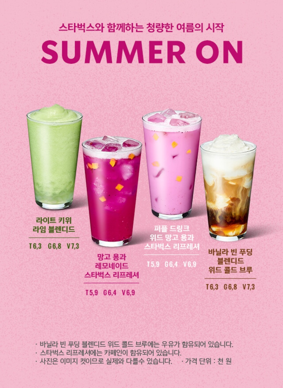 이번 스타벅스 여름 한정 메뉴에는 위 4가지 음료가 있습니다.