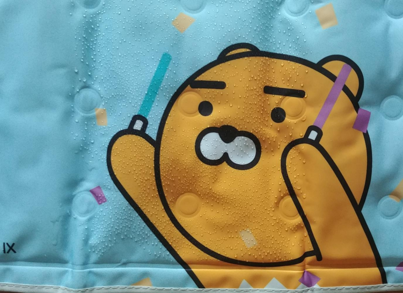 카카오프렌즈 제품이다 보니 매트 앞면에 카카오프렌즈 캐릭터가 크게 나와있습니다. 여러 캐릭터가 있지만, 제가 받은 카카오프렌즈 아이스 쿨매트에는 라이언이 그려져 있습니다. 턱 부분이 보름달처럼 크게 나와서 뭔가 엉성하지만, 그래도 상당히 귀여운 것 같습니다. 양 손에 형광봉을 들고 무언가를 응원하고 있는 그림입니다. 뭘 응원하고 있는지는 잘 모르겠습니다.