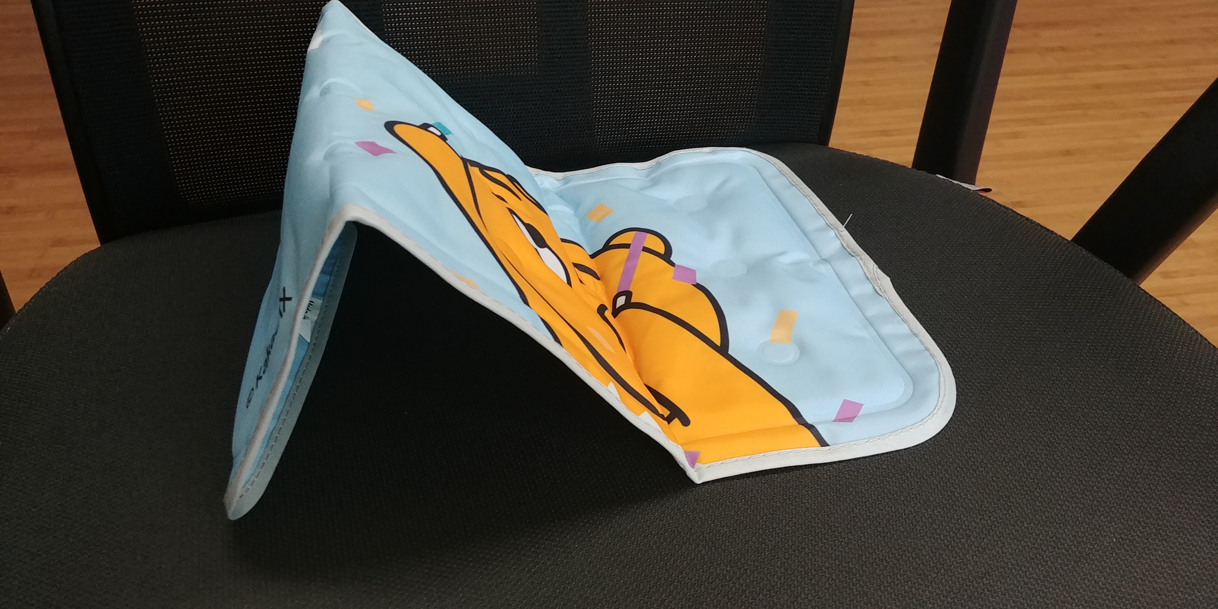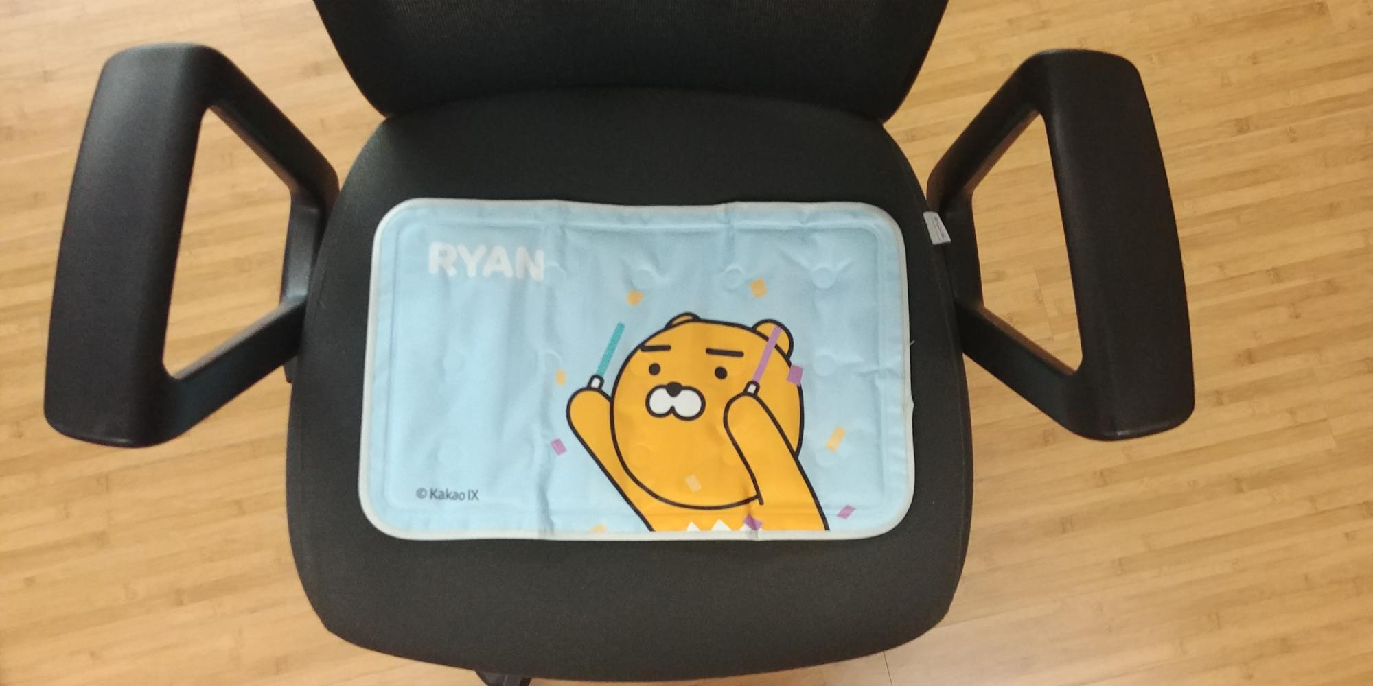 사용법은 간단합니다. 이렇게 의자에 놓고 앉으시면 됩니다. 냉장실이나 냉동고에 제품을 넣지 않아도 은근히 시원합니다. 아직 날씨가 많이 덥지 않아서 그럴 수 있지만, 오히려 너무 차갑지 않고 괜찮은 것 같습니다. 하지만 냉장고에 넣어두고 쓴다면 카카오프렌즈 아이스 쿨메트의 효과를 극대화시킬 수 있습니다.