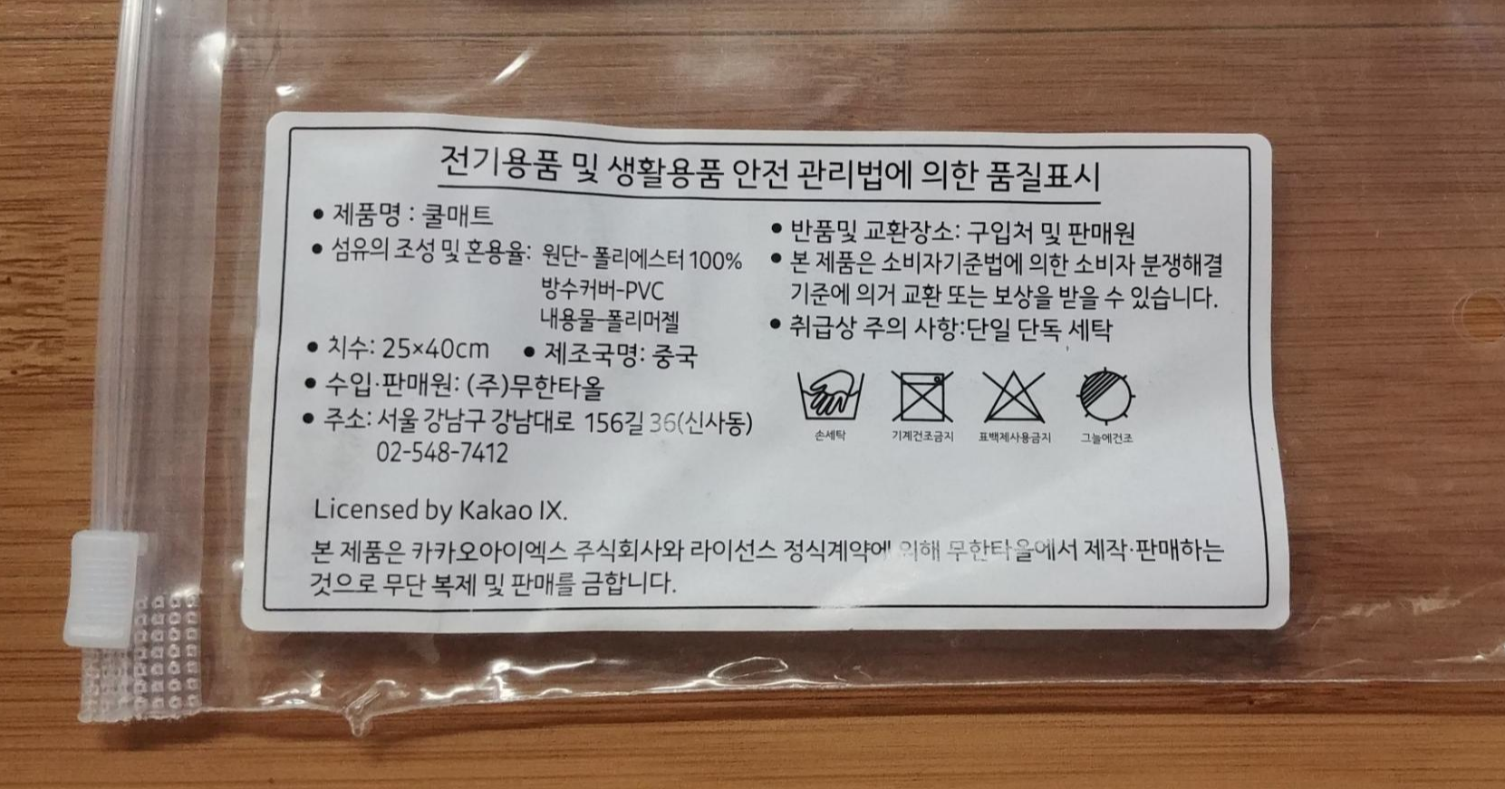 제품 정보는 위의 사진과 같습니다. 라이언이 뭔가 엉성한 데에는 다 이유가 있었습니다. 제조국명을 자세히 보시면 그 나라에서 만들었다는 것을 알 수 있습니다. 나머지 정보들을 살펴보면, 섬유의 조성 및 혼용률, 치수, 수입 및 판매원, 취급상 주의 사항 등이 나와있다는 것을 알 수 있습니다. 단일 단독 세탁을 하라는 점을 빼고는 별로 중요하지 않으니 넘어가도록 하겠습니다.