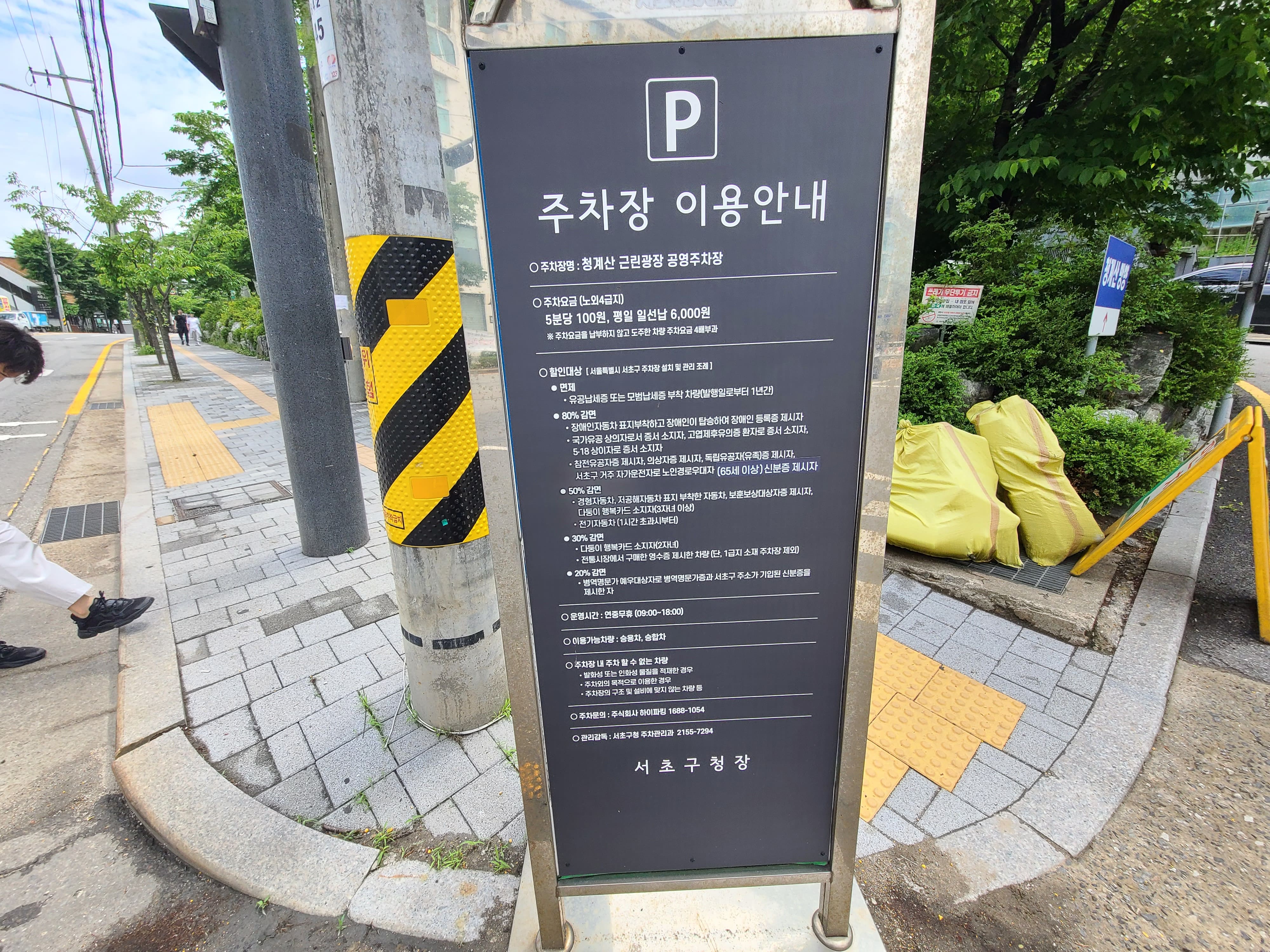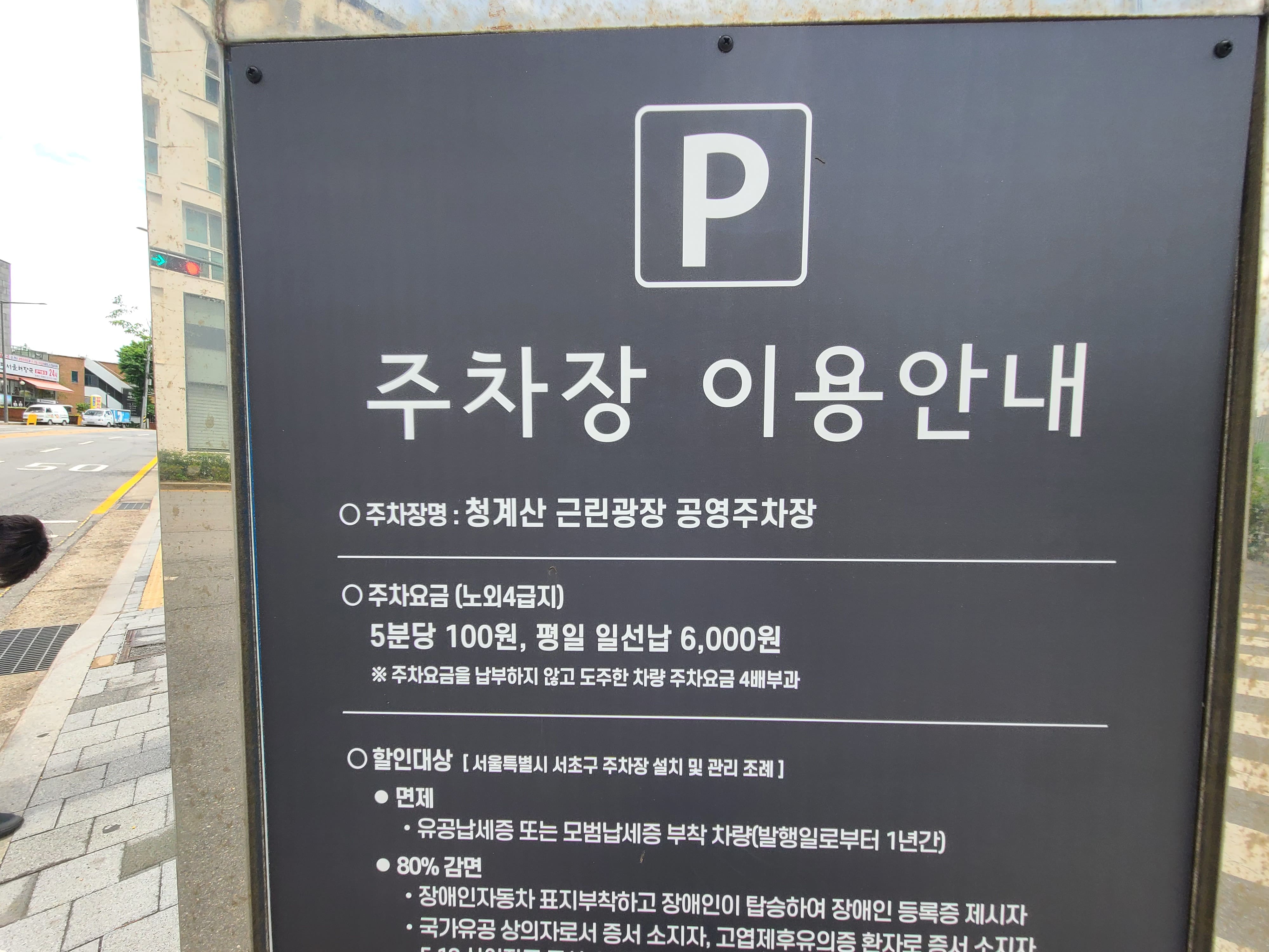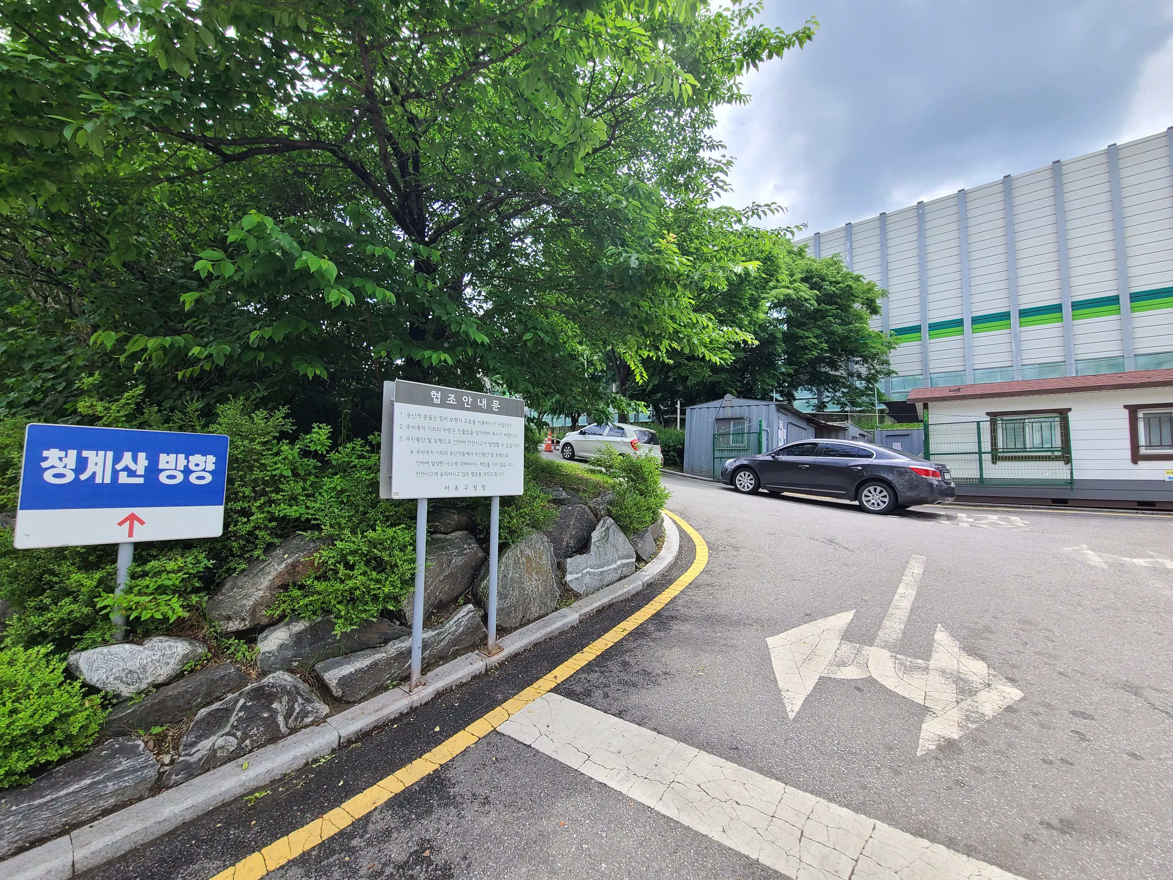 위에서 말씀드린 방향으로 쭉 가시다보면 이렇게 청계산 근린광장 공영주차장이 있습니다.
