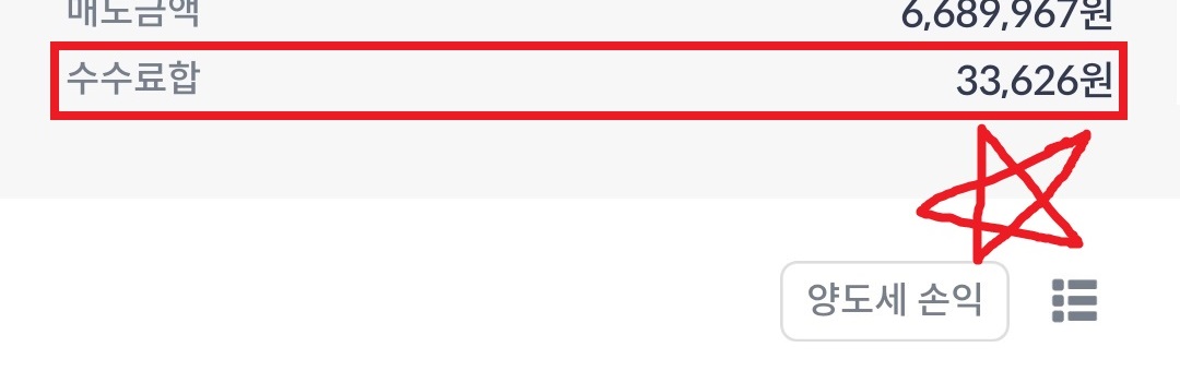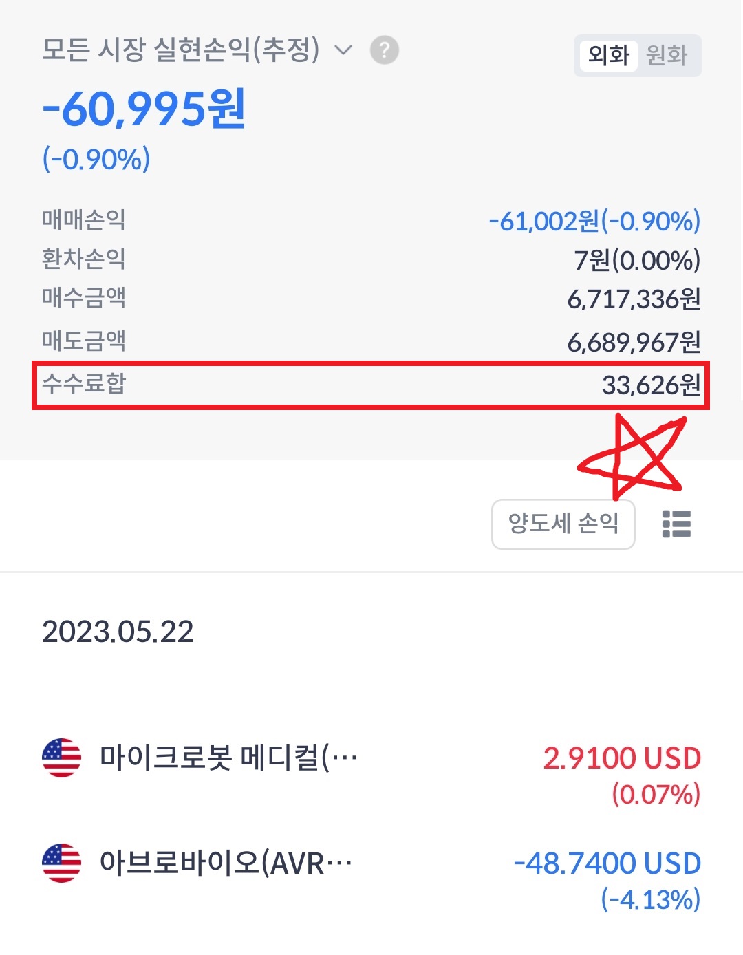 그런데 위 사진을 보면, 제가 이번 미국주식 단타 매매를 통해 지불한 총 수수료 합이 33,626원으로 수수료가 약 109원 정도 더 나왔다는 것을 알 수 있습니다.