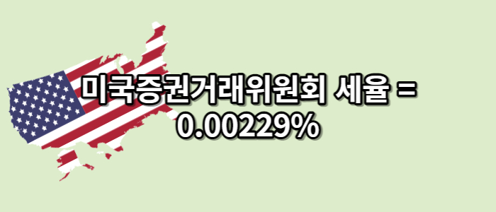 미국증권거래위원회 세금의 요율은 0.00229%입니다. 그러니까 총 100만 원의 미국주식을 매도했다면 미국증건거래위원회 세금이 100만 원 곱하기 0.0000229를 해서 약 22.9원이 나오게 됩니다.